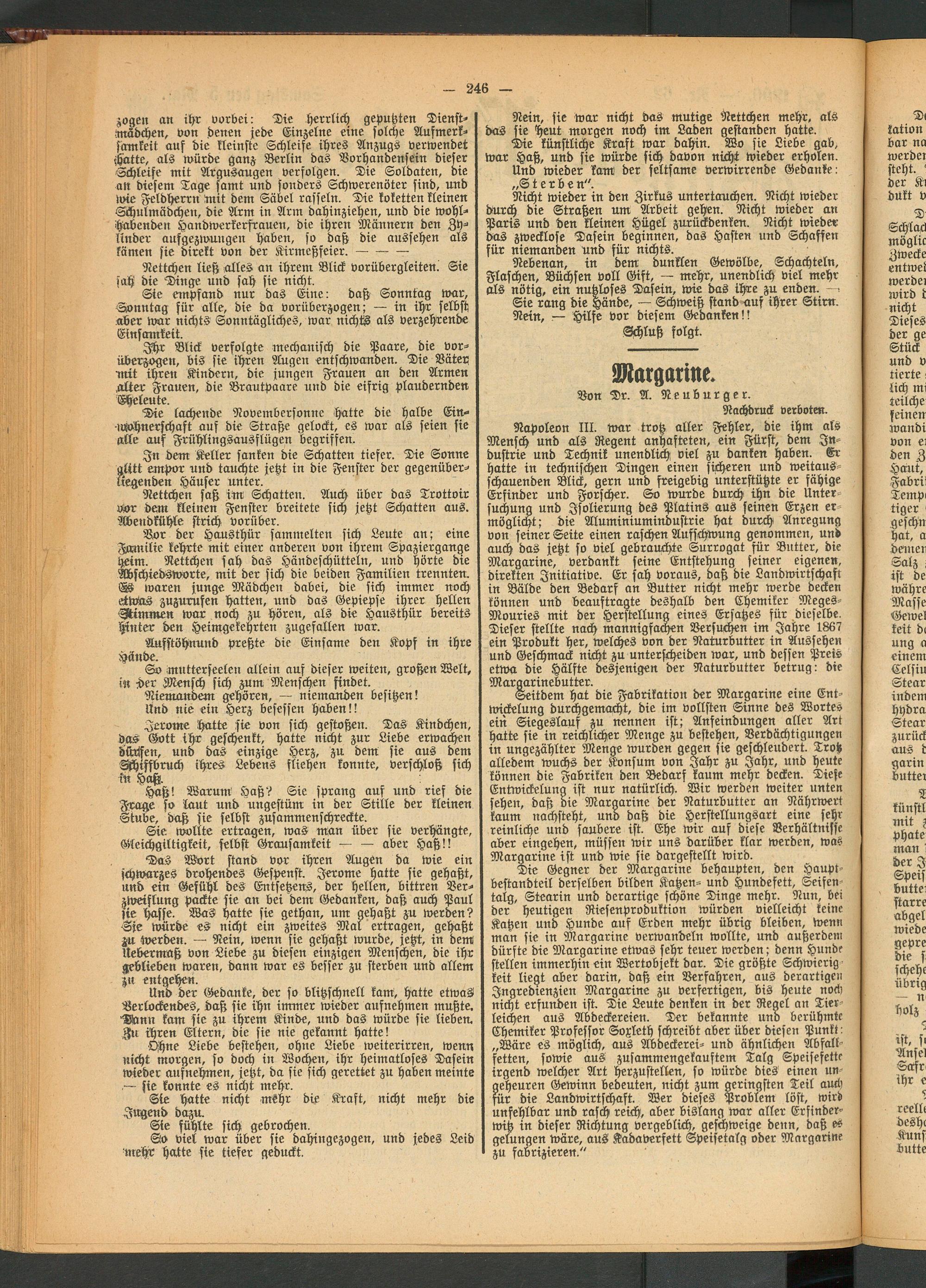Napoleon III. war trotz aller Fehler, die ihm als Mensch und als Regent anhafteten, ein Fürst, dem Industrie und Technik unendlich viel zu danken haben. Er hatte in technischen Dingen einen sicheren und weitausschauenden Blick, gern und freigebig unterstützte er fähige Erfinder und Forscher. So wurde durch ihn die Untersuchung und Isolierung des Platins aus seinen Erzen ermöglicht; die Aluminiumindustrie hat durch Anregung von seiner Seite einen raschen Aufschwung genommen, und auch das jetzt so viel gebrauchte Surrogat für Butter, die Margarine, verdankt seine Entstehung seiner eigenen, direkten Initiative. Er sah voraus, daß die Landwirtschaft in Bälde den Bedarf an Butter nicht mehr werde decken können und beauftragte deshalb den Chemiker Meges- Mouries mit der Herstellung eines Ersatzes für dieselbe. Dieser stellte nach mannigfachen Versuchen im Jahre 1867 ein Produkt her, welches von der Naturbutter in Aussehen und Geschmack nicht zu unterscheiden war, und dessen Preis etwa die Hälfte desjenigen der Naturbutter betrug: die Margarinebutter.