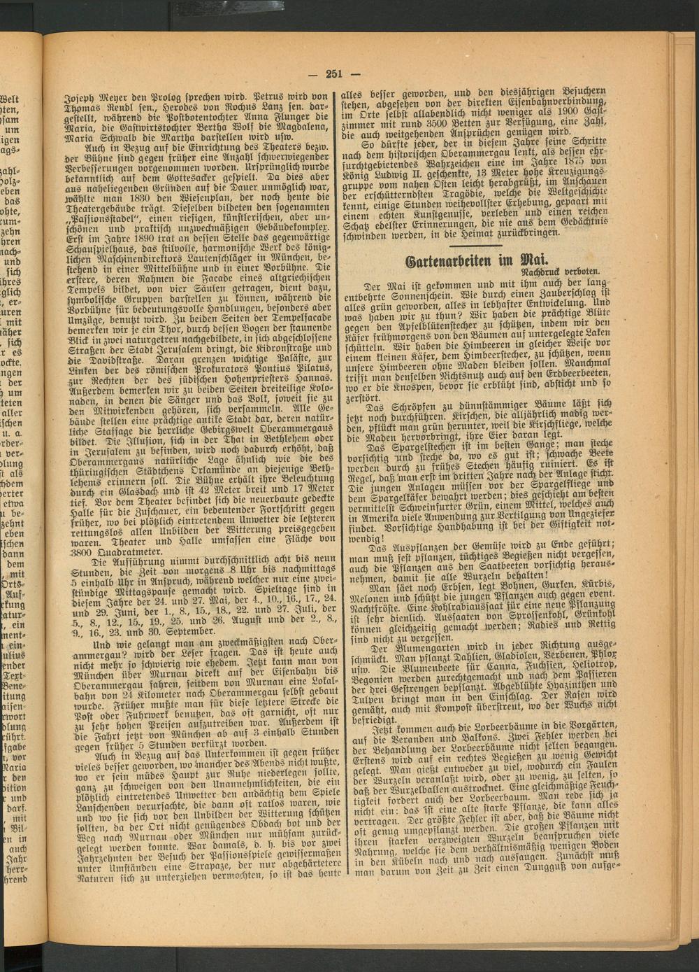 ' " Auch in Bezug auf das Unterkommen ist gegen früher vieles besser geworden, wo'mancher des Abends nicht wußte, wo er sein müdes Haupt zur Ruhe mederlegen sollte ganz zu schweigen von den Unannehmlichkeiten, die em plötzlich eintretendes Unwetter den andächtig dem Spiele Lauschenden verursachte, die dann oft ratlos waren, wie und wo sie sich vor den Unbilden der Witterung schützen sollten, da der Ort nicht genügendes Obdach bot und der Weg nach Murnau oder München nur mühsam zuruck- qelegt werden konnte. War damals, d. h. bis vor zwei Jahrzehnten der Besuch der Passivus,snele gewissermaßen unter Umständen eine Strapaze, der nur abgehärtetere Maturen sich zu unterziehen vermochten, so ist das Heuti