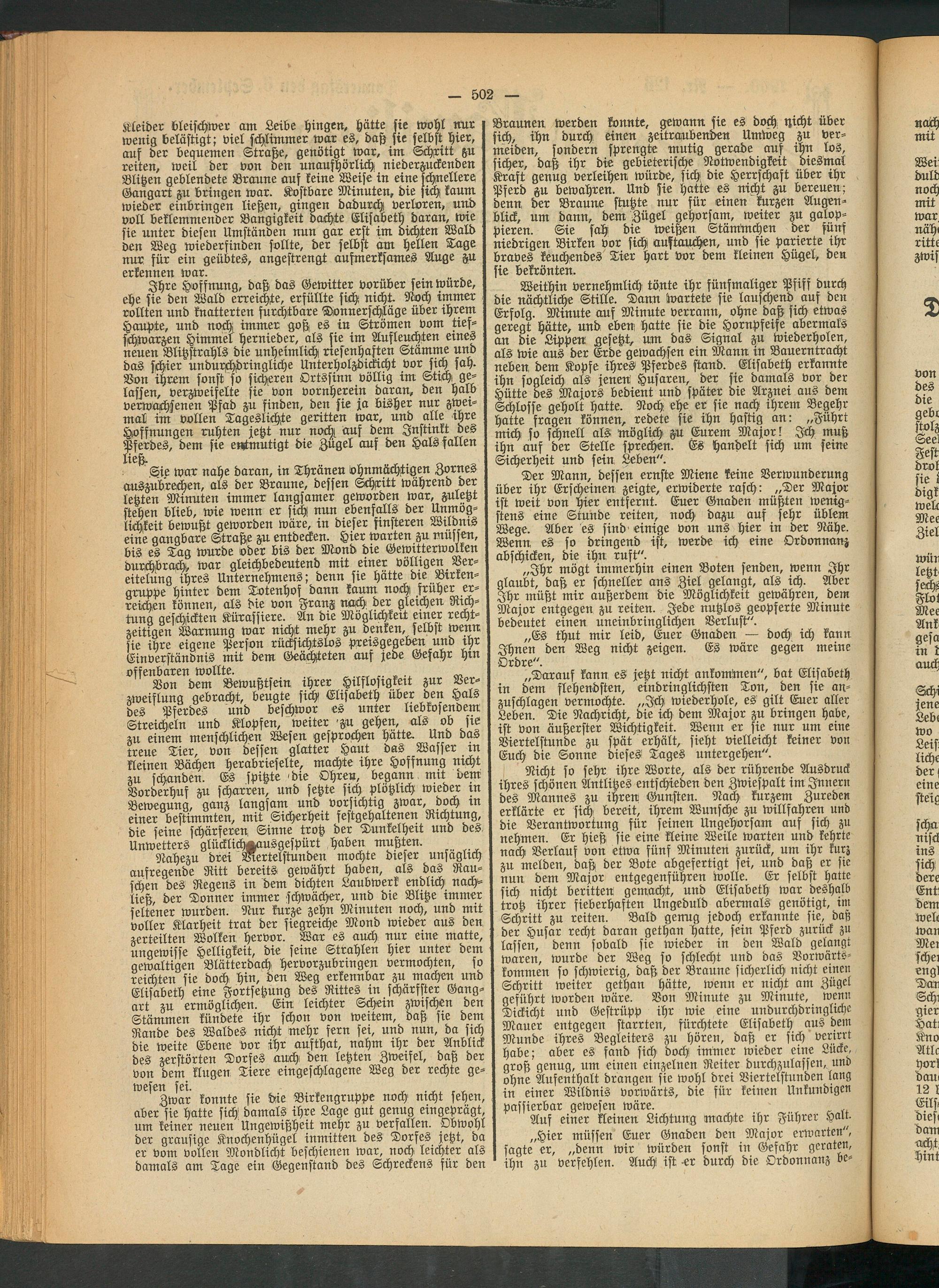 Kleider bleischwer am Leibe hingen, hätte sie wohl nur wenig belästigt; viel schlimmer war es, daß sie selbst hier, auf der bequemen Strahe, genötigt war, im Schxitt zu reiten, weil der von den unaufhörlich niederzuckenden Blitzen geblendete Braune auf keine Weise in eine schnellere Gangart zu bringen war. Kostbare Minuten, die sich kaum wieder einbringen ließen, gingen dadurch verloren, und voll beklemmender Bangigkeit dachte Elisabeth daran, wie sie unter diesen Umständen nun gar erst im dichten Wald den Weg wiederfinden sollte, der selbst am Hellen Tage nur für ein geübtes, angestrengt aufmerksames Auge zu erkennen war. „