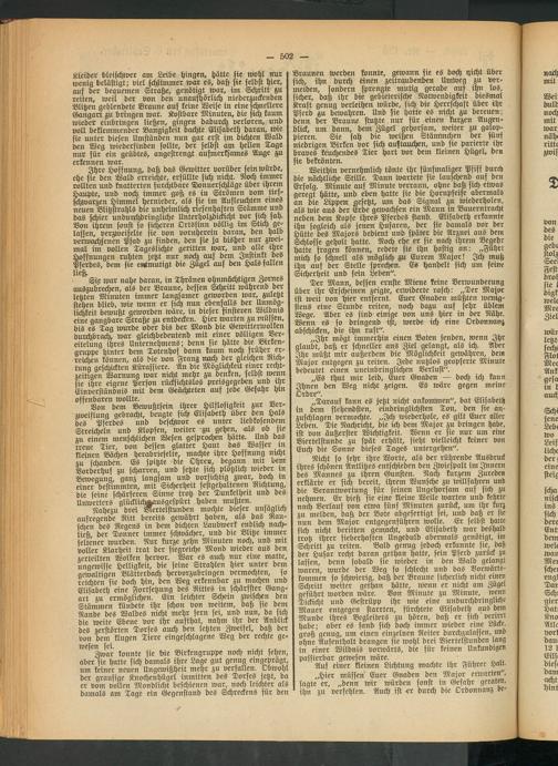 Nicht so sehr ihre Worte, als der rührende Ausdruck ihres schönen Antlitzes entschieden den Zwiespalt im Innern des Mannes zu ihren Gunsten. Nach kurzem Zureden erklärte er sich- bereit, ihrem Wunsche zu willfahren und die Verantwortung für seinen Ungehorsam auf sich zu nehmen. Er hieß sie eine kleine Weile warten und kehrte nach Verlauf von etwa fünf Minuten zurück, um ihr kurz zu melden, daß der Bote abgefertigt sei, und daß er sie nun dem Major entgegenführen wolle. Er selbst hatte sich nicht beritten« gemacht, und Elisabeth war deshalb trotz ihrer fieberhaften Ungeduld abermals genötigt, im Schritt zu reiten. Bald genug jedoch erkannte sie, daß der Husar recht daran gethan hatte, sein Pferd zurück zu lassen, denn sobald sie wieder in den Wald gelangt waren, wurde der Weg so schlecht und das Vorwärts- kommen so schwierig, daß der Braune sicherlich nicht einen Schritt weiter gethan hätte, wenn er nicht am Zügel geführt worden wäre. Von Minute zu Minute, wenn Dickicht und Gestrüpp ihr wie eine undurchdringliche Mauer entgegen starrten, fürchtete Elisabeth aus dem Munde ihres Begleiters zu hören, daß er sich verirrt habe; aber es fand sich doch immer wieder eine Lücke, groß genug, um einen einzelnen Reiter durchzulassen, und ohne Aufenthalt drangen sie wohl drei Viertelstunden lang in einer Wildnis vorwärts, die für keinen Unkundigen passierbar gewesen wäre. . .. u