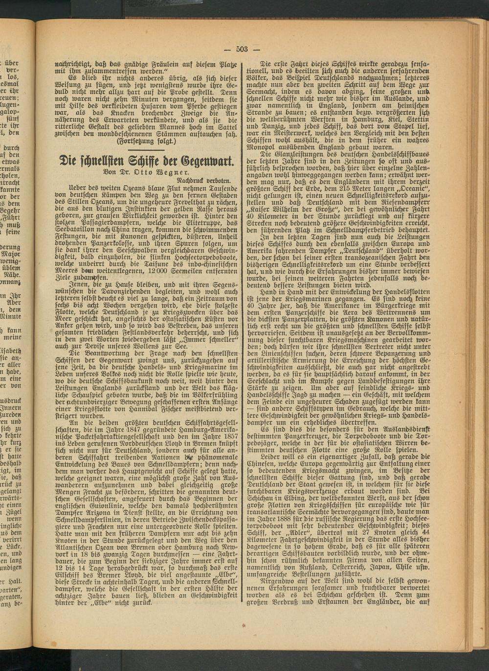In den letzten Tagen sind nun auch die Leistungen dieses Schiffes durch den ebenfalls zwischen Europa und Amerika fahrenden Dampfer „Deutschland" überholt worden, der schon bei seiner ersten transozeanischen Fahrt den bisherigen Schnelligkeitsrekord um eine Stunde verbessert hat, und wie durch die Erfahrungen bisher immer bewiesen wurde, bei seinen weiteren Fahrten jedenfalls noch bedeutend bessere Leistungen bieten wird.
