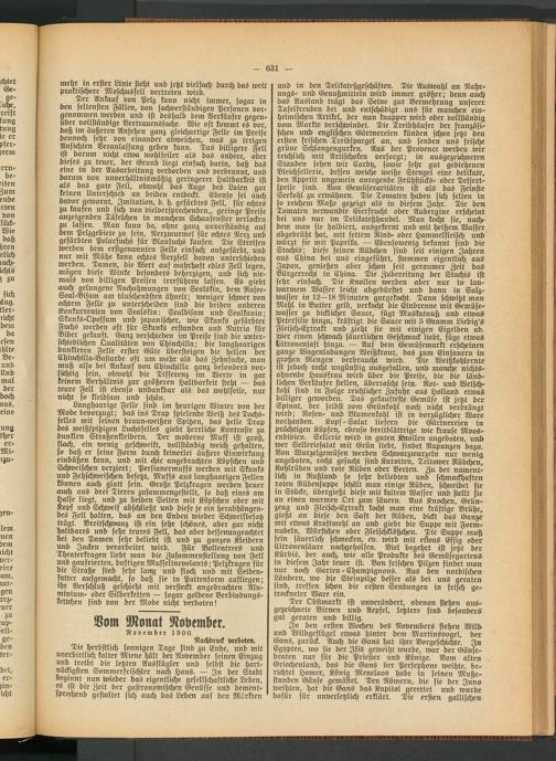In den ersten Wochen des Novembers stehen Wild und Wildgeflügel etwas hinter dem Martinsvogel, der Gans, zurück. Auch! die Gans hat ihre Vorgeschichte. In Egypten, wo sie der Isis geweiht wurde, war der Gänsebraten nur für die Priester und Könige. Vom alten Griechenland, das die Gans der Persephone weihte, berichtet Homer, König Menelaos habe in seinen Mußestunden Gänse gemästet. Den Römern, die sie der Juno weihten, hat die Gans das Kapitol gerettet und wurde dafür für unverletzlich erklärt. Die ersten gallischen