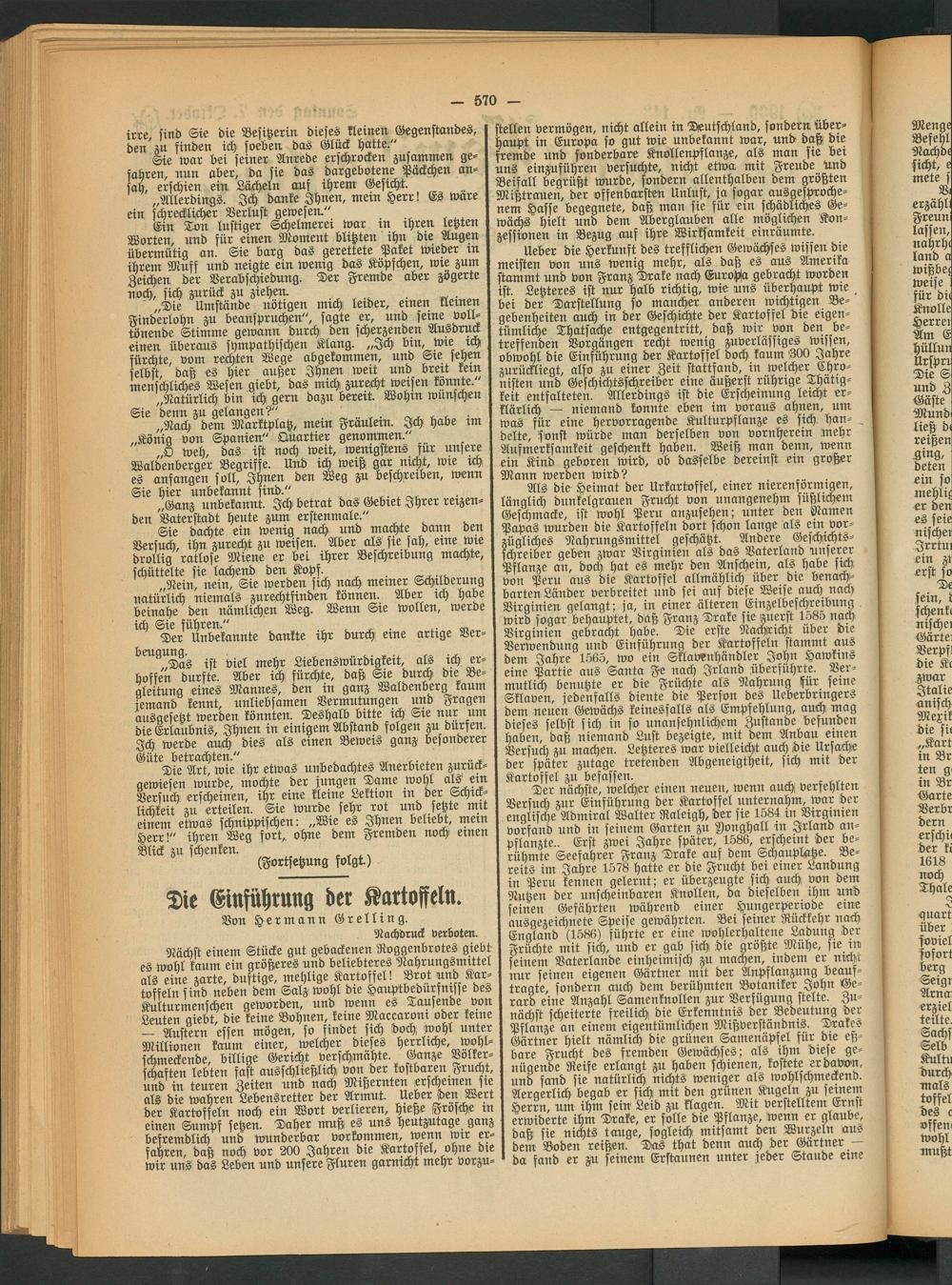 Ueber die Herkunft des trefflichen Gewächses wissen die meisten von uns wenig mehr, als daß es aus Amerika stammt und von Franz Drake nach Europa gebracht worden ist. Letzteres ist nur halb richtig, wie uns überhaupt wie . bei der Darstellung so mancher anderen wichtigen Begebenheiten auch in der Geschichte der Kartoffel die eigentümliche Thatsache entgegentritt, daß wir von den betreffenden Vorgängen recht wenig zuverlässiges wissen, obwohl die Einführung der Kartoffel doch kaum 1300 Jahre zurückliegt, also zu einer Zeit stattfand, in welcher Chronisten und Geschichtsschreiber eine äußerst rührige Thatig- keit entfalteten. Allerdings ist die Erscheinung leicht erklärlich — niemand konnte eben im voraus ahnen, um was für eine hervorragende Kulturpflanze es fich Han- , beite, sonst würde man derselben von vornherein mehr Aufmerksamkeit geschenkt haben. Weiß man denn, wenn ein Kind geboren wird, ob dasselbe dereinst ein großer Mann werden wird?