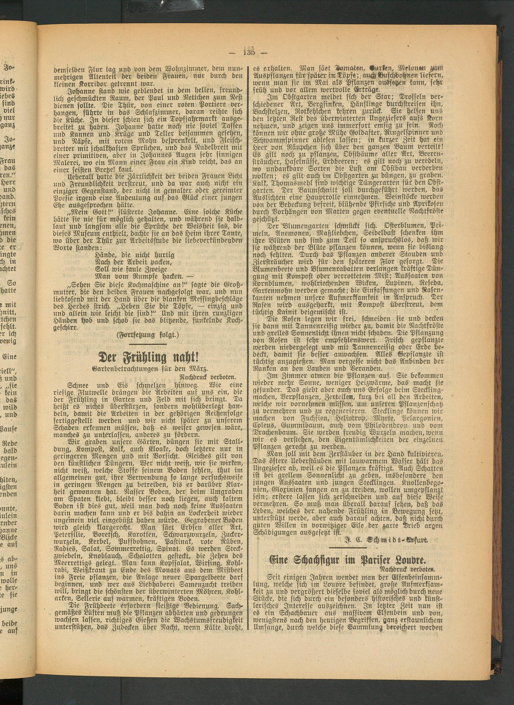 Wir graben unsere Gärten, düngen sie mit Stall- dung, Kompost, Kalk, auch Kloake, doch letztere nur in geringeren Mengen und mit Vorsicht. Gleiches gilt von den künstlichen Düngern. Wer nicht weiß, wie sie wirken, nicht weiß, welche Stoffe seinem Boden fehlen, thut im allgemeinen gut, ihre Verwendung so lange versuchsweise in geringen Mengen zu betreiben, bis er darüber Klarheit gewonnen hat. Nasser Boden, der beim Umgraben am Spaten klebt, bleibt besser noch liegen, auch kaltem Boden ist dies gut, weil man doch noch keine Aussaaten darin machen kann und er bis dahin an Lockerheit wieder ungemein viel eingebüßt haben würde. Gegrabener Boden wird gleich klargerecht. Man säet Erbsen aller Art, Petersilie, Boretsch, Karotten, Schwarzwurzeln, Zuckerwurzeln, Kerbel, Puffbohnen, Pastinak, rote Rüben, Radies, Salat, Sommerrettig, Spinat. Es werden Steckzwiebeln, Knoblauch, Schalotten gesteckt, die Zehen des Meerrettias gelegt. Man kann Kopfsalat, Wirsing, Kohlrabi, Weißkraut zu Ende des Monats aus dem Mistbeet ins Freie pflanzen, die Anlage neuer Spargelbeete darf beginnen, und wer aus Liebhaberei Samenzucht treiben will, bringt die schönsten der überwinterten Möhren, Kohl- arken, Sellerie auf warmen, kräftigen Boden.