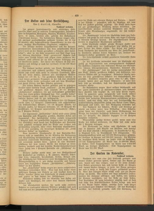 Ter sogenannte „holländische" Kakao wird unter Zusatz von Pottasche und Magnesia geröstet, Gaedkes Kakao mit Ammoniak. Der holländische Kakao enthält demgemäß 4 Prozent Kali, der gewöhnliche dagegen nur 1,6 Prozent. Die Löslichkeit wird durch das Aufschließen mit Pottasche nicht gehoben, vielmehr wird die Masse nur leichter und gleichmäßig aufgelöst, ohne einen Bodensatz abzuscheiden; es ist aber unrichtig, ein derartiges Präparat als „leicht löslichen Kakao" zu bezeichnen.