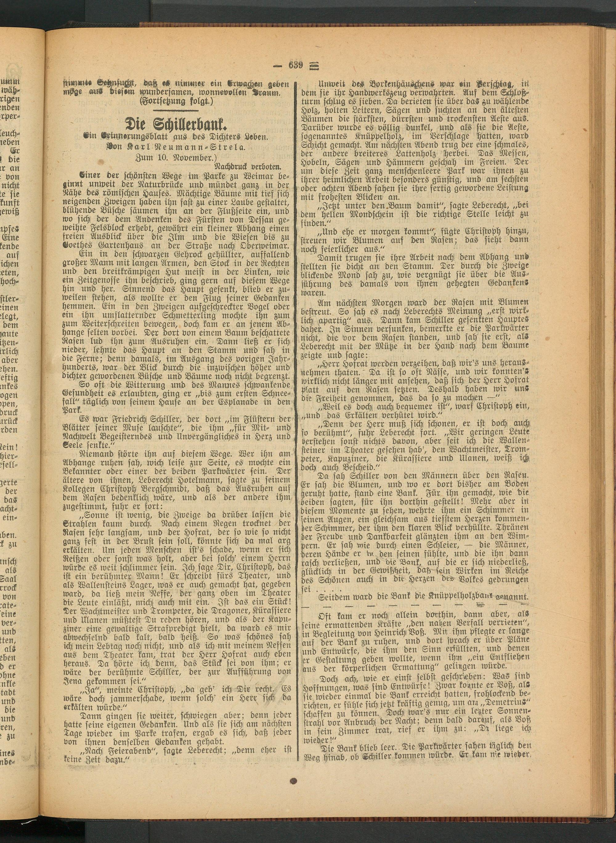 Da sah Schiller von den Männern über den Rasen. Er sah die Blumen, und wo er dort bisher am Boden geruht hatte, stand eine Bank. Für ihn gemacht, wie die beiden sagten, für ihn dorthin gestellt! Mehr aber in diesem Momente zu sehen, wehrte ihm ein Schimmer in feinen Augen, ein gleichsam aus tiefstem Herzen kommender Schimmer, der ihm den klaren Blick verhüllte. Thränen der Freude und Dankbarkeit glänzten ihm an den Wimpern. Er sah wie durch einen Schleier, — die Männer, bereit Hände er ht den seinen fühlte, und die ihn dann rasch! verließen, und die Bank, auf die er sich niederließ, glücklich! in der Gewißheit, daß fein Wirken im Reiche des Schönen auch in die Herzen dev Volkes gedrungen sei ... .