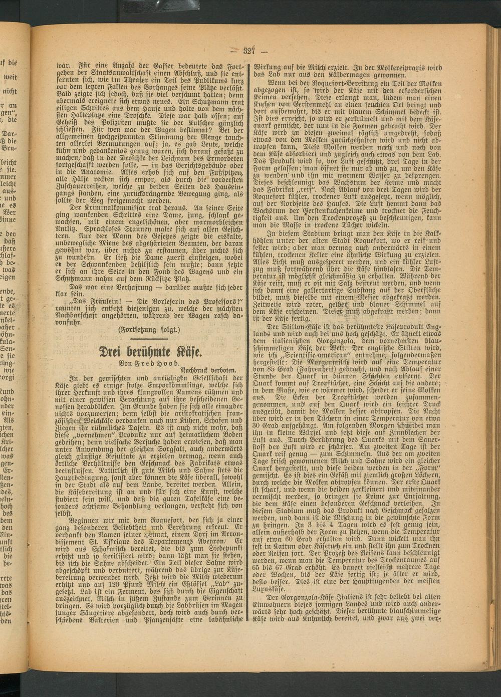 Beginnen wir mit dem Roquefort, der sich ja einer ganz besonderen Beliebtheit und Verehrung erfreut. Er verdankt den Namen seiner Heimat, einem Dorf im Arrondissement St. Affrique des Departements Avehron.' Er wird aus Schafmilch bereitet, die bis zum Siedepunkt erhitzt und so sterilisiert wird; dann läßt man sie stehen, bis sich die Sahne abscheidet.' Ein Teil dieser Sahne wird abgeschöpft und verbuttert, während das übrige zur Käsebereitung verwendet wird. Jetzt wird die Milch wiederum erhitzt und auf 120 Pfund Milch ein Eßlöffel „Lab" zu- gesetzt. Lab ist ein Ferment, das sich! durch die Eigenschaft auszeichnet, Milch in süßem Zustande zum Gerinnen zu bringen. Es wird vorzüglich durch die Labdrüsen im Magen junger Säugetiere abgesondert, doch! wird auch durch verschiedene Bakterien und Pfanzenfäfte eine labähnliche
