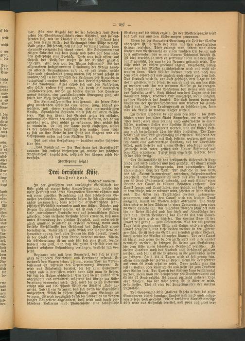 Der Stilton-Käse ist das berühmteste Käseprodukt Englands und wird auch bei uns hoch geschätzt. Er ähnelt etwas dem italienischen Gorgonzola, dem vornehmsten blau- schimmeligen Käses der Welt. Der englische Stilton wird, wie ich „Seientifie-american" entnehme, folgendermaßen hergestellt: Die Morgenmilchi wird auf eine Temperatur von 85 Grad (Fahrenheit) gebracht, und nach Ablauf einer Stunde der Quark in dünnen Schichten entfernt. Der Quark kommt auf Tropftücher, eine Schicht auf die andere; in dem Maße, wie er wärmer wird, scheidet er feine Molken aus. Die Ecken der Tropftücher werden zusammengenommen, und auf den Quark wird ein leichter Druck ausgeübt, damit die Molken besser abtropfen. Die Nacht über wird er in den Tüchern in einer Temperatur von etwa 30 Grad aufgehängt. Am folgenden Morgen schneidet man ihn in kleine Würfel und setzt diese auf Zinnblechen der Lust aus.. Durch Berührung des Quarks mit dein Sauerstoff der Luft wird er schärfer. Arn zweiten Tage ist der Quark reif genug — zum Schimmeln. Aus der am zweiten Tage frisch gewonnenen Milch und Sahne wird ein gleicher Quark hergestellt, und diese beiden werden in der „Form" gemischt. Es ist dies ein Gefäß mit ziemlich großen Löchern, durch welche die Molken abtropfeu können. Der erste Quark ist schärf, und wenn die beiden zerkleinert und miteinander vermischt werden, so bringen sie Keime zur Entfaltung, die dem Käse einen besonderen Geschmack verleihen. In diesem Stadium muß das Produkt nach Geschwäck gesalzen werden, und dann ist die Mischüng in die gewünschte Form zu bringen. In 3 bis 4 Tagen wird es fest genug fein, allein außerhalb der Form zu stehen, wenn die Temperatur auf etwa 60 Grad erhalten wird. Daun wickelt man ihn fest in Kattun oder Käsetuch ein und stellt ihn zum Trocknen oder Reifen fort. Der Prozeß des Reifens kann beschleunigt werden, wenn man die Temperatur des Trockenraumes auf 65 bis 67 Grad erhöht. Es dauert vielleicht mehrere Tage oder Wochen, bis der Käse fertig ist; je älter er wird, desto besser. Dies ist eine der Haupttugenden der meisten Luxuskäse.