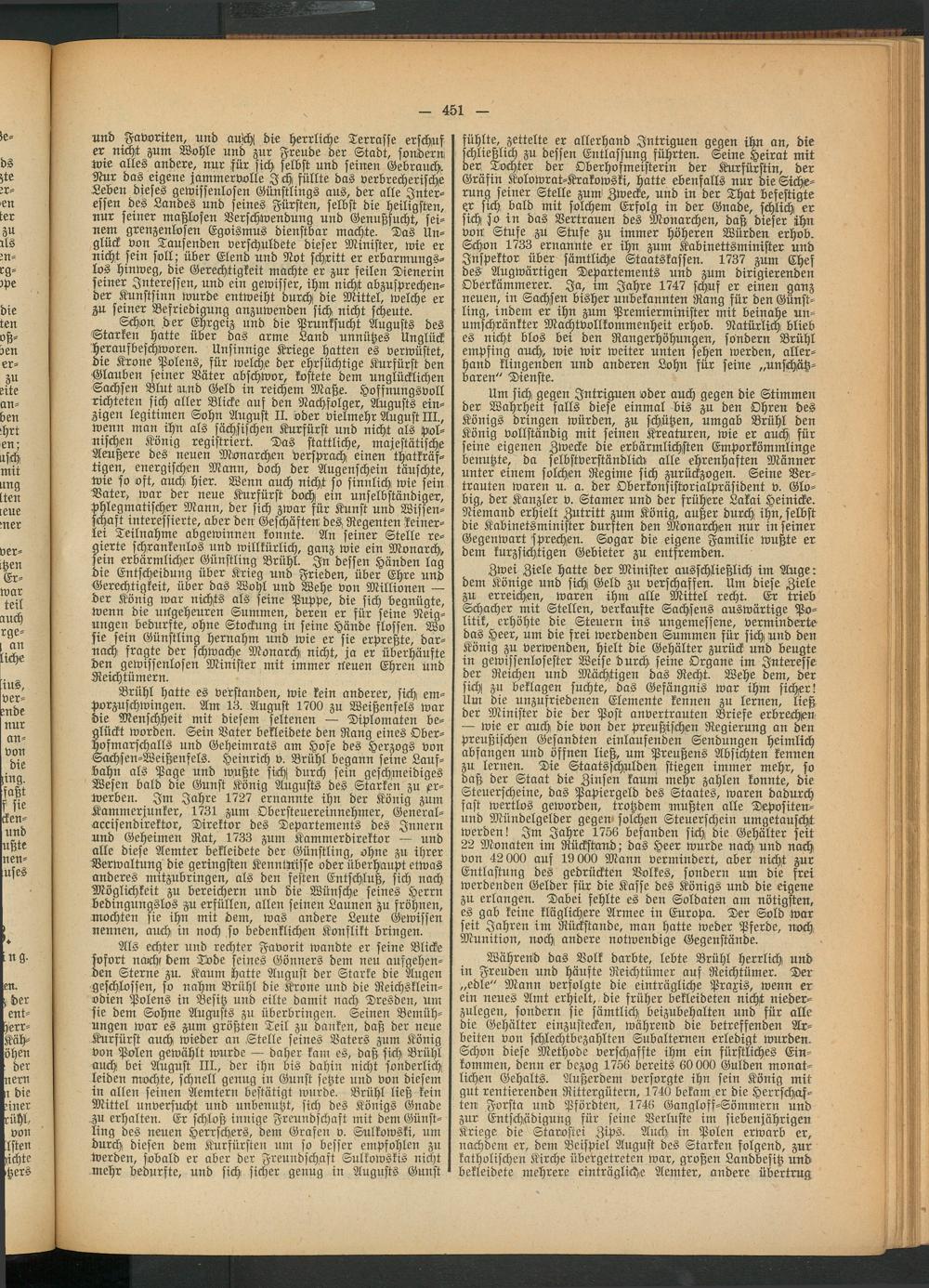 Während das Volk darbte, lebte Brühl herrlich und in Freuden und häufte Reichtümer auf Reichtümer. Der „edle" Mann verfolgte die einträgliche Praxis, wenn er ein neues Amt erhielt, die früher bekleideten nicht niederzulegen, sondern sie sämtlich beizubehalten und für alle die Gehälter einzustecken, während die betreffenden Arbeiten von schlechtbezahlten Subalternen erledigt wurden. Schon diese Methode verschaffte ihm ein fürstliches Einkommen, denn er bezog 1756 bereits 60 000 Gulden monatlichen Gehalts. Außerdem versorgte ihn sein König mit gut rentierenden Rittergütern, 1740 bekam er die Herrschaften Forsta und Pfördten, 1746 Gangloff-Sömmern und zur Entschädigung für seine Verluste im siebenjährigen Kriege die Starostei Zips. Auch in Polen erwarb er, nachdem er, dem Beispiel August des Starken folgend, zur katholischen Kirche übergetreten war, großen Landbesitz und bekleidete mehrere einträgliche Aemter, andere übertrug