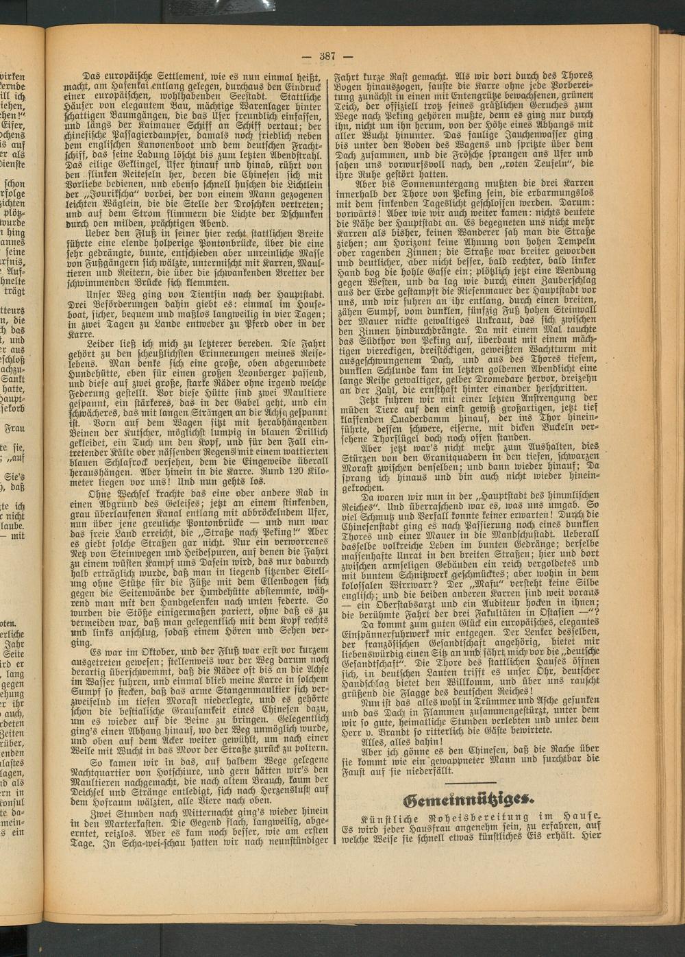 Ohne Wechsel krachte das eine oder andere Rad in einen Abgrund des Geleises; jetzt an einem' stinkenden, grau überlaufenen Kanal entlang mit abbröckelndem Ufer, nun über jene greuliche Pontonbrücke — und nun war das freie Land erreicht, die „Straße nach Peking!" Aber es giebt solche Straßen gar nicht. Nur ein verworrenes Netz von Steinwegen und Heidespuren, aus denen die Fahrt zu einem wüsten Kampf ums Dasein wird, das nur dadurch! halb erträglich wurde, daß man in liegend sitzender Stellung ohne Stütze für die Füße mit dem Ellenbogen sich gegen die Seitenwände der Hundehütte abstemmte, während man mit den Handgelenken nach unten federte. So wurden die Stöße einigermaßen pariert, ohne daß es zu vermeiden war, daß man gelegentliche mit dem Kopf rechts und links anschlug, sodaß einem Hören und Sehen ver- war im Oktober, und der Fluß war erst vor kurzem ausgetreten gewesen; stellenweis war der Weg darum noch derartig überschwemmt, daß die Räder oft bis an die Achse int Wasser fuhren, und einmal blieb meine Karre in solchem Sumpf so stecken, daß das arme Stangenmaultier siche verzweifelnd im tiefen Morast niederlegte, und es gehörte schon die bestialische Grausamkeit eines Chinesen dazu, um es wieder auf die Beine zu bringen. Gelegentlich ging's einen Abhang hinauf, wo der Weg unmögliche wurde, und oben auf dem Acker weiter gewühlt, um nach einer Weile mit Wucht in das Moor der Straße zurück zu poltern.