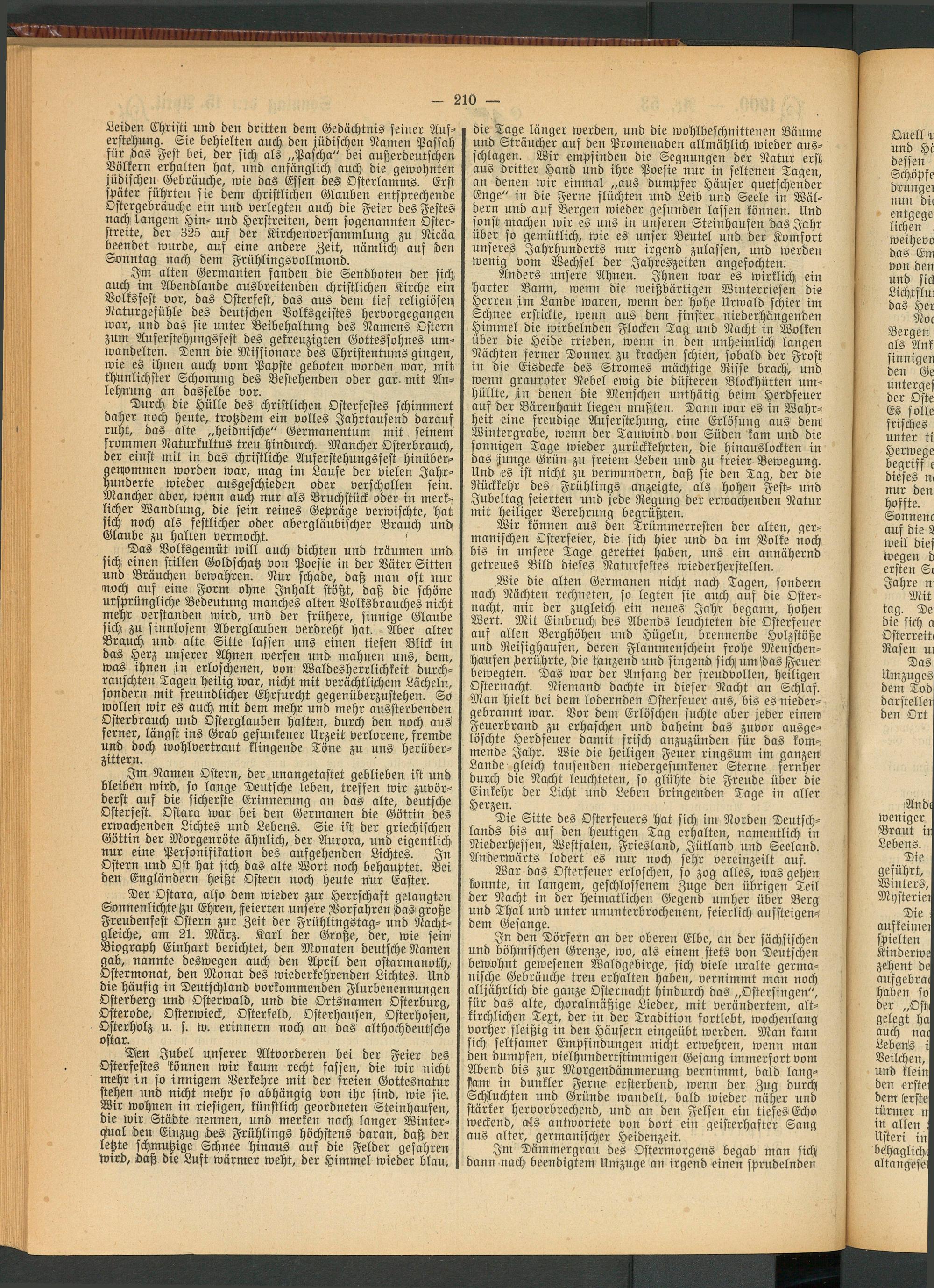 Den Jubel unserer Altvorderen bei der Feier des Osterfestes können wir kaum recht fassen, die wir nicht mehr in so innigem Verkehre mit der freien Gottesnatur stehen und nicht mehr so abhängig von ihr sind, wie sie. Wir wohnen in riesigen, künstlich geordneten Steinhaufen, die wir Städte nennen, und merken nach langer Winter- qüal den Einzug des Frühlings höchstens daran, daß der letzte schmutzige Schnee hinaus auf die Felder gefahren wird, daß die Luft wärmer weht, der Himmel wieder blau,