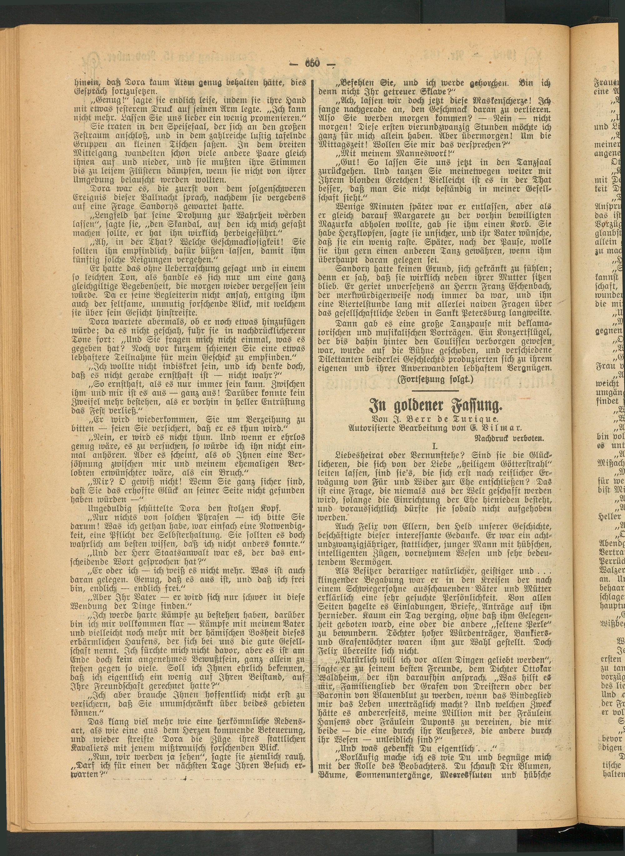 „Gut! So lassen Sie uns jetzt in den Tanzsaal zurückgehen. Und tanzen Sie meinetwegen weiter mit Ihrem blonden Gretchen! Vielleicht ist es in der That besser, daß man Sie nicht beständig in meiner Gesellschaft sieht."