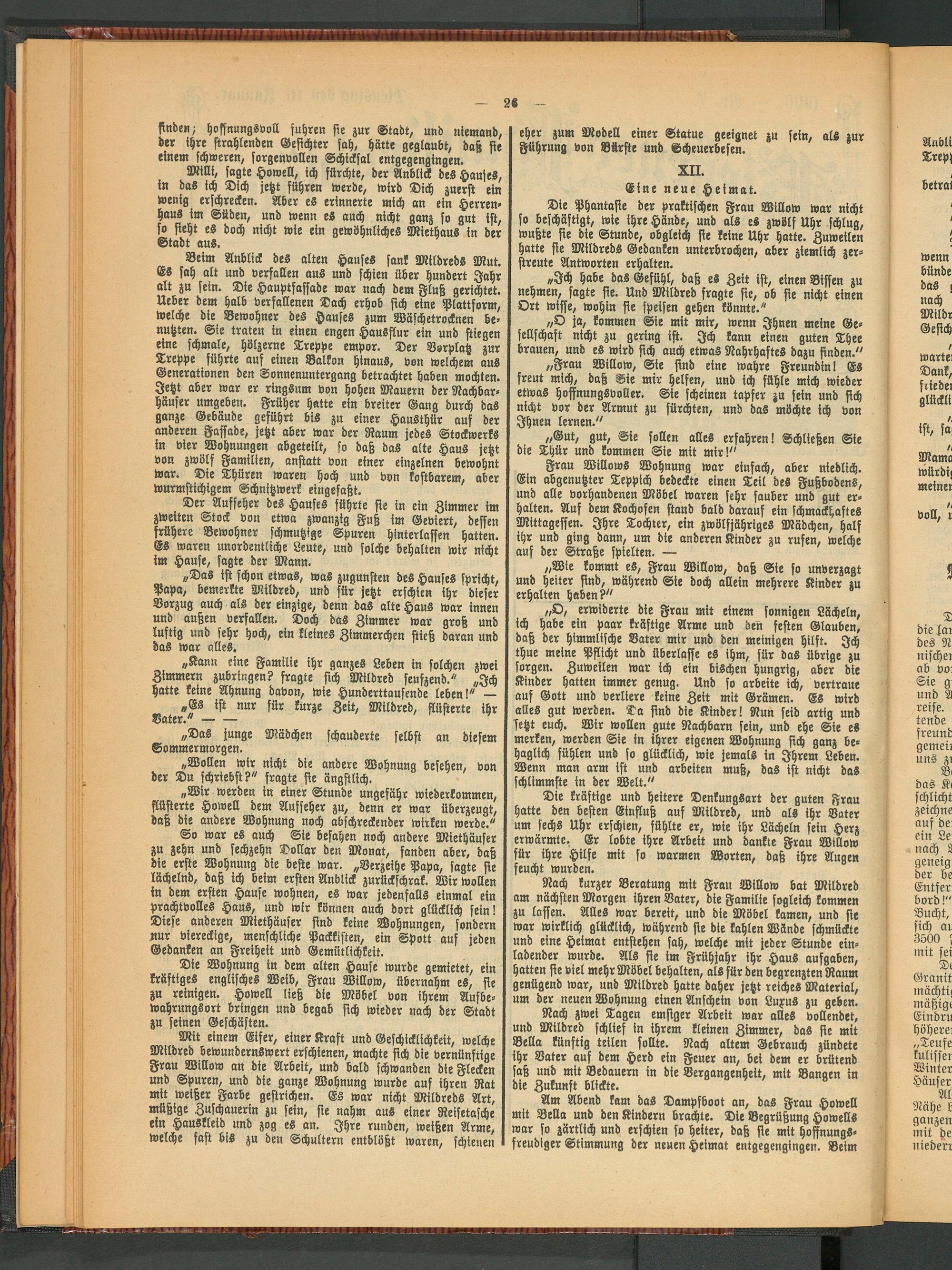 Frau Willowö Wohnung war einfach, aber niedlich. Ein abgenutzter Teppich bedeckte einen Teil des Fußbodens, und alle vorhandenen Möbel waren sehr sauber und gut erhalten. Auf dem Kochofen stand bald darauf ein schmackhaftes Mittagessen. Ihre Tochter, ein zwölfjähriges Mädchen, half ihr und ging dann, um die anderen Kinder zu rufen, welche auf der Straße spielten. —