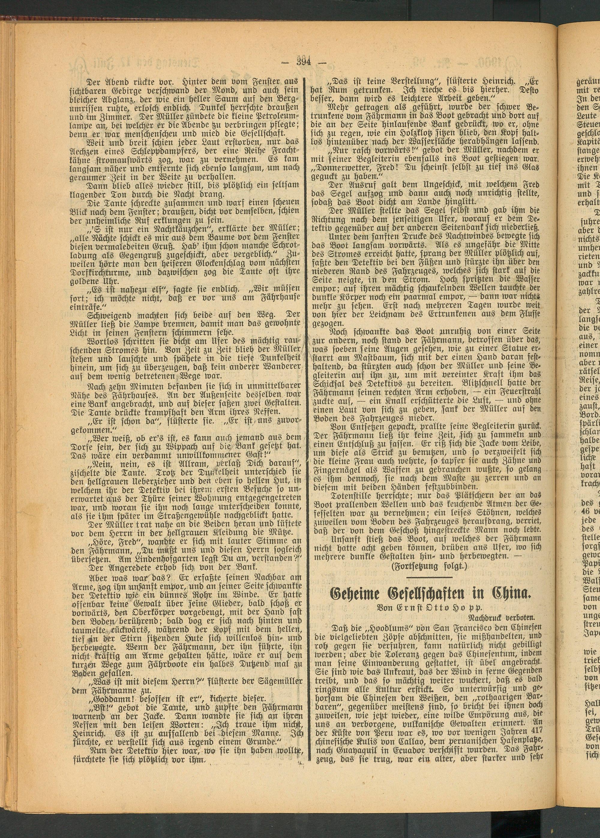 Unter dem sanften Drucke des Nachtwindes bewegte sich das Boot langsam vorwärts. Als es ungefähr die Mitte des Stromes erreicht hätte, sprang der Müller plötzliche auf, faßte den Detektiv bei den Füßen und stürzte ihn über den niederen Rand des Fahrzeuges, welches sich stark auf die Seite neigte, in den Strom. Hoch spritzten die Wasser empor; auf ihren mächtig fchaukelnden Wellen tauchte der dunkle Körper noch, ein paarmal empor, — dann war nichts mehr zu sehen. Erst nach mehreren Tagen wurde weit von hier der Leichnam des Ertrunkenen aus dem Flusse gezogen.