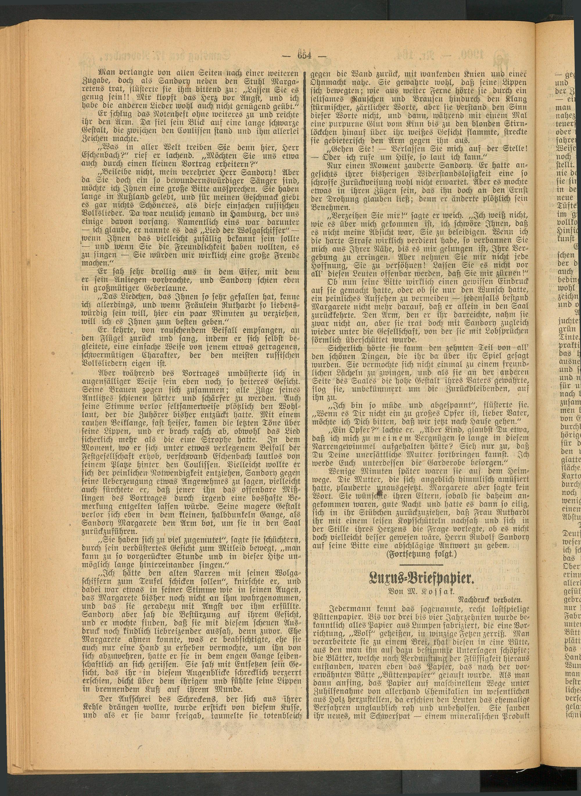 Man verlangte von allen Seiten nach einer weiteren Zugabe, doch als Sandory neben den Stuhl Margaretens trat, flüsterte sie ihm bittend zu: „Lassen Sie es genug sein!! Mir klopft das Herz vor Angst, und ich! habe die anderen Lieder wohl auch nicht genügend geübt."