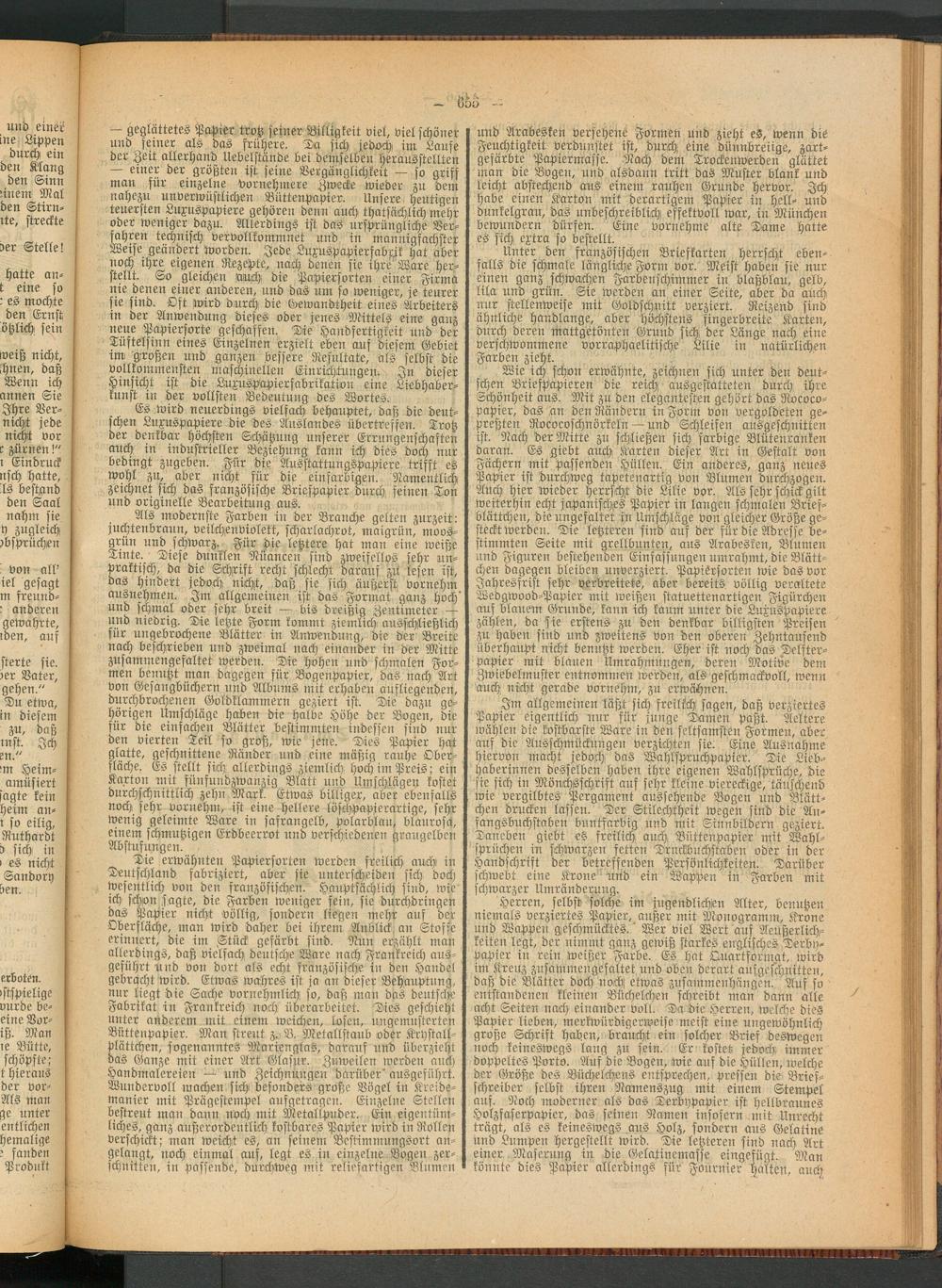 Es wird neuerdings vielfach behauptet, daß die deutschen Luxuspapiere die des Auslandes übertreffen. Trotz der denkbar höchsten Schätzung unserer Errungenschaften auch in industrieller Beziehung kann ich dies doch nur bedingt zugeben. Für die Ausstattungspapiere trifft es wohl zu, aber nicht für die einfarbigen. Namentlich zeichnet sich das französische Briefpapier durch feinen Ton und originelle Bearbeitung aus.
