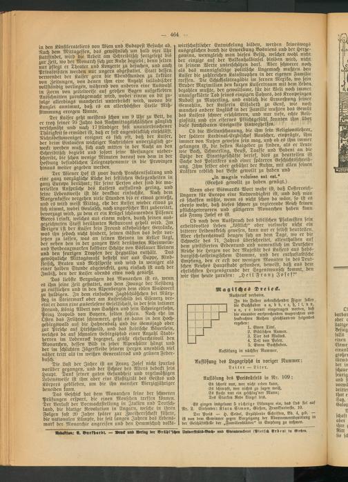 in den Künstlerateliers von Wien und Budapest Besuche ab. Nach dem Mittagessen, das gewöhnlich, um halb vier Uhr stattfindet, wird die Arbeit am Schreibtisch fortgesetzt bts zur Zeit, wo der Monarch sich zur Ruhe begiebt; denn selten nur pflegt er Theater und Konzerte zu besuchen, und auch Privatvisiten werden nur ungern abgestattet. Statt dessen verwendet der Kaiser gern die Abendstunden zu Lektüre von Zeitungen, vonLeuen ihm eine Anzahl inländrscher vollständig vorliegen, während von anderen eine Auswahl in Form von zettelweise auf grbßen Bogen ausgeklebten Ausschnitten zurechtgemacht wird, wobei einem on btt zufolge allerdings mancherlei unterdrückt wird, wovon dre Kanzlei annimmt, daß es an allerhöchster Stelle Mtß- stimtnung erregen könnte.