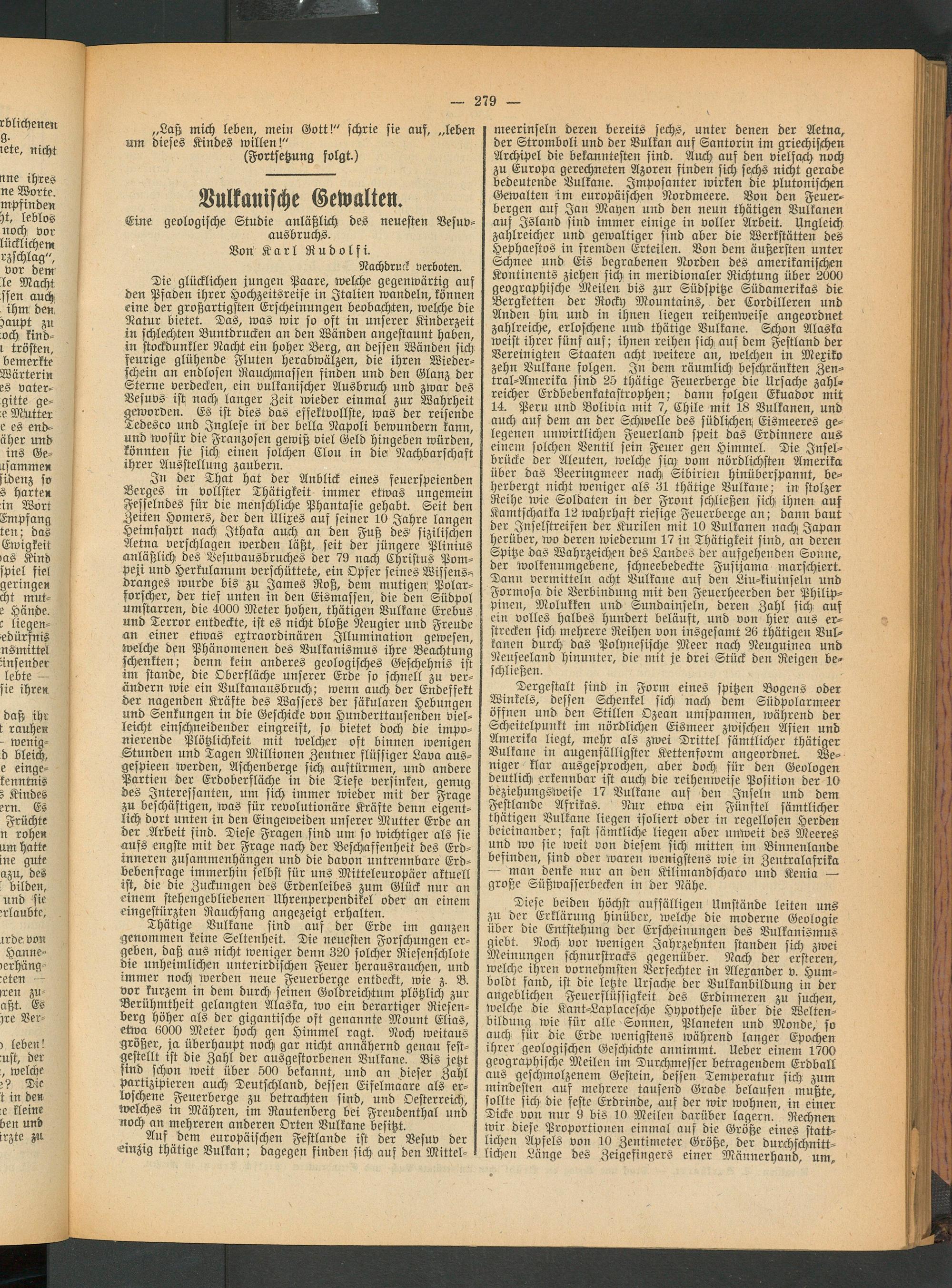 In der That hat der Anblick eines feuerspeienden Berges in vollster Thätigkeit immer etwas ungemein Fesselndes für die menschliche Phantasie gehabt. Seit den Zeiten Homers, der den Ulixes auf seiner 10 Jahre langen Heimfahrt nach Ithaka auch an den Fuß des sizilischen Aetna verschlagen werden läßt, seit der jüngere Plinius anläßlich des Vesuvausbruches der 79 nach Christus Pompeji und Herkulanum verschüttete, ein Opfer seines Wissensdranges wurde bis zu James Roß, dem mutigen Polarforscher, der tief unten in den Eismassen, die den Südpol umstarren, die 4000 Meter hohen, thätigen Vulkane Erebus und Terror entdeckte, ist es nicht bloße Neugier und Freude an einer etwas extraordinären Illumination gewesen, welche den Phänomenen des Vulkanismus ihre Beachtung schenkten; denn kein anderes geologisches Geschehnis ist im stände, die Obersläche unserer Erde so schnell zu verändern wie ein Vulkanausbruch; wenn auch der Endeffekt der nagenden Kräfte des Wassers der säkularen Hebungen und Senkungen in die Geschicke von Hunderttausenden vielleicht einschneidender eingreift, so bietet doch die imponierende Plötzlichkeit mit welcher oft binnen wenigen Stunden und Tagen Millionen Zentner flüssiger Lava aus- gespieen werden, Aschenberge sich auftürmen, und andere Partien der Erdoberfläche in die Tiefe versinken, genug des Interessanten, um sich immer wieder mit der Frage zu beschäftigen, was für revolutionäre Kräfte denn eigentlich dort unten in den Eingeweiden unserer Mutter Erde an der Arbeit sind. Diese Fragen sind um so wichtiger als sie aufs engste mit der Frage nach der Beschaffenheit des Erdinneren zusammenhängen und die davon untrennbare Erdbebenfrage immerhin selbst für uns Mitteleuropäer aktuell ist, die die Zuckungen des Erdenleibes zum Glück nur an einem stehengebliebenen Uhrenperpendikel oder an einen: eingestürzten Rauchfang angezeigt erhalten.