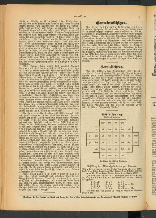 lität der Mahlzeiten ist es jedoch leider häufig dort, wo sich- das Kind stärken und erholen soll,, recht herzlich! schlecht bestellt. Die Suppen sind oft dünn; die Fleischbrühe läßt an Kraft und Gehalt zu wünschen übrig; zu Suppen-Einlagen wird nicht selten das Billigste verwendet und dies in sehr Monotoner Weise. Auch der Wohlgeschmack der Suppen nach dem Suppengrün, den pflanzlichen Zusätzen, die mit ausgekocht werden, ist lange nicht so gut, wie daheim. „So eine Suppe, wie die Mutter zu Haus sie bereitet, giebt's eben anderswo nicht." Das hört man oft. Aber glücklicherweise giebt es hier eine Hilfe, und diese verdanken wir Maggi, welcher es verstanden hat, alles zu einer guten Suppe gehörige in konzentrierte Form zu bringen, in eine Form, welche Nährwert und Schmackhaftigkeit, Billigkeit und leichte Bereitungsart vereinigt, keinem Verderben ausgesetzt ist, sich überall mitnehmen läßt, ohne Platz, im Koffer zu beanspruchen und jederzeit, wenn man nur heißes Wasser zur Verfügung hat, die rasche Herstellung einer prächtigen Suppe ermöglicht.