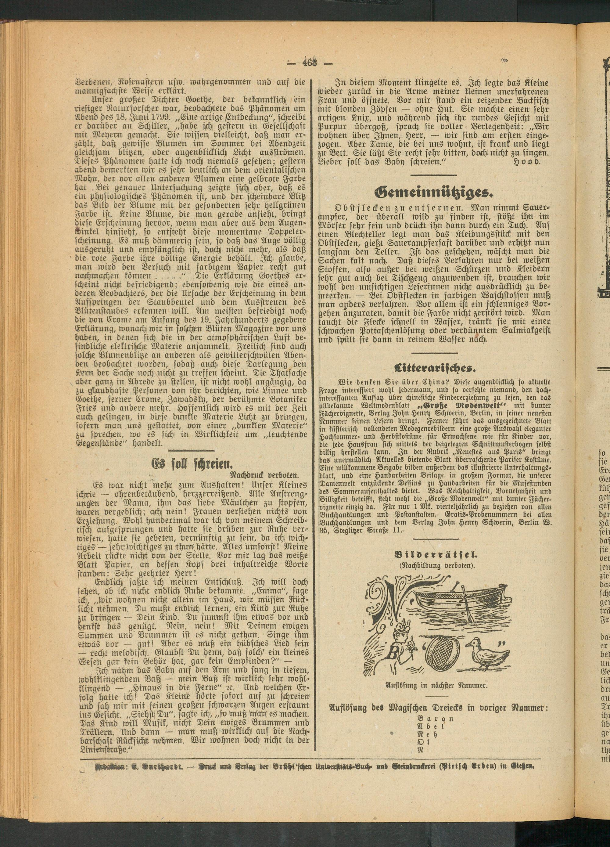 Wie denken Sie über China? Diese augenblicklich so aktuelle Frage interessiert wohl jedermann, und so verfehle niemand, den hoch- interefsanten Aussatz über chinesische Kindererziehung zu lesen, den das allbekannte Weltmodenblatt „Grotze Modenwelt" mit bunter Fächervignette, Verlag John Henry Schwerin, Berlin, in seiner neuesten Nummer seinen Lesern bringt. Ferner führt das ausgezeichnete Blatt in küstlerisch vollendeten Modegenrebildern eine große Auswahl eleganter Hochsommer- und Herbstkostüme für Erwachsene wie für Kinder vor, die jede Hausfrau sich mittels der beigelegten Schnittmusterbogen selbst billig herstellen kann. In der Rubrik „Neuestes aus Paris" bringt das unermüdlich Aktuelles bietende Blatt überraschende Pariser Kostüme. Eine willkommene Beigabe bilden außerdem das illustrierte Unterhaltungsblatt, und eine Handarbeiten Beilage in großem Format, die unserer Damenwelt entzückende Dessins zu Handarbeiten für die Musestunden des Sommeraufenthaltes bietet. Was Reichhaltigkeit, Vornehmheit und Billigkeit betrifft, steht wohl die „Große Modenwelt" mit bunter Fächervignette einzig da. Für nur 1 Mk. vierteljährlich zu beziehen von allen Buchhandlungen und Postanstalten. Gratis-Probenummern bei allen Buchhandlungen und dem Verlag John Henry Schwerin, Berlin W. 35, Steglitzer Straße 11.
