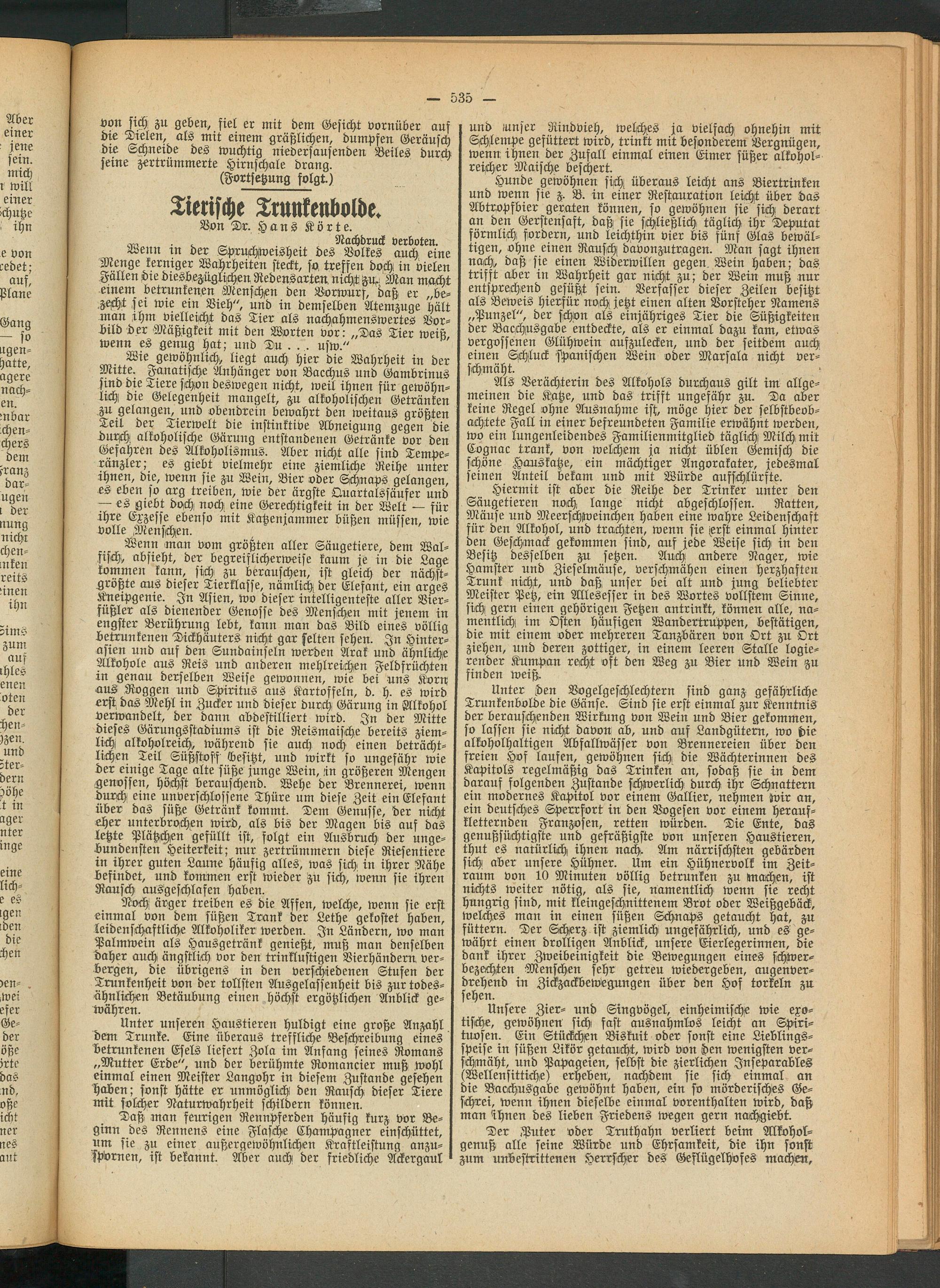 Unter unseren Haustieren huldigt eine große Anzahl dem Trünke. Eine überaus treffliche Beschreibung eines betrunkenen Esels liefert Zola im Anfang seines Romans „Mutter Erde", und der berühmte Romancier muß wohl einmal einen Meister Langohr in diesem Zustande gesehen haben; sonst hätte er unmöglich den Rausch dieser Tiere mit solcher Naturwahrheit schildern können.