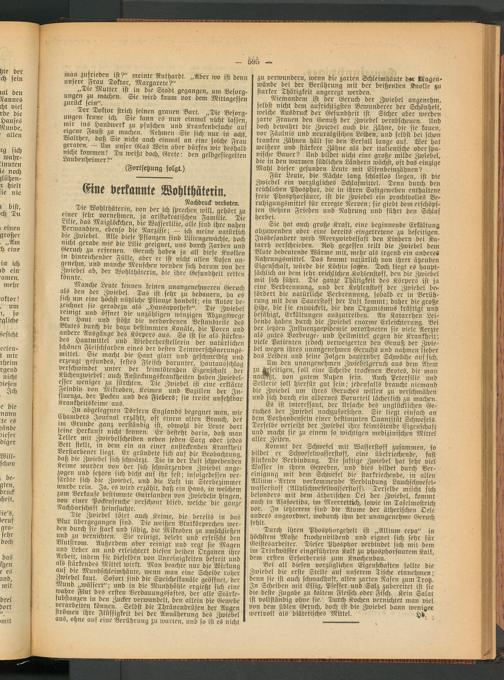 als stärkendes Mittel wirkt. Man beachte nur die Wirkung I Bei all diesen vorzüglichen Eigenschaften sollte die auf die Mundschleimhäute, wenn man eine Scheibe roher I Zwiebel die erste Stelle auf unserem Tische einnehmen; Zwiebel kaut. Sofort sind die Speichelkanäle geöffnet, der I denn sie ist auch schmackhaft, allen zarten Nasen zum Trotz. Mund „wässert"; und in die Mundhöhle ergießt sich eine I In Scheiben mit Essig, Pfeffer und Salz zubereitet ist sie wahre Flut des ersten Verdauungssaftes, der alle Stärke- I die beste Zugabe zu kaltem Fleisch oder Fisch. Keilt Salat substanzen in den Zucker verwandelt, den allein die Gewebe I ist vollständig ohne sie/ Durch Kochen vernichtet man viel verarbeiten können. Selbst die Thränendrüsen der Augen I von dem üblen Geruch, doch ist die Zwiebel dann weniaer strömen ihre Flüssigkeit bei der Annäherung des Zwiebel I wertvoll als diätetisches Mittel. Htz.