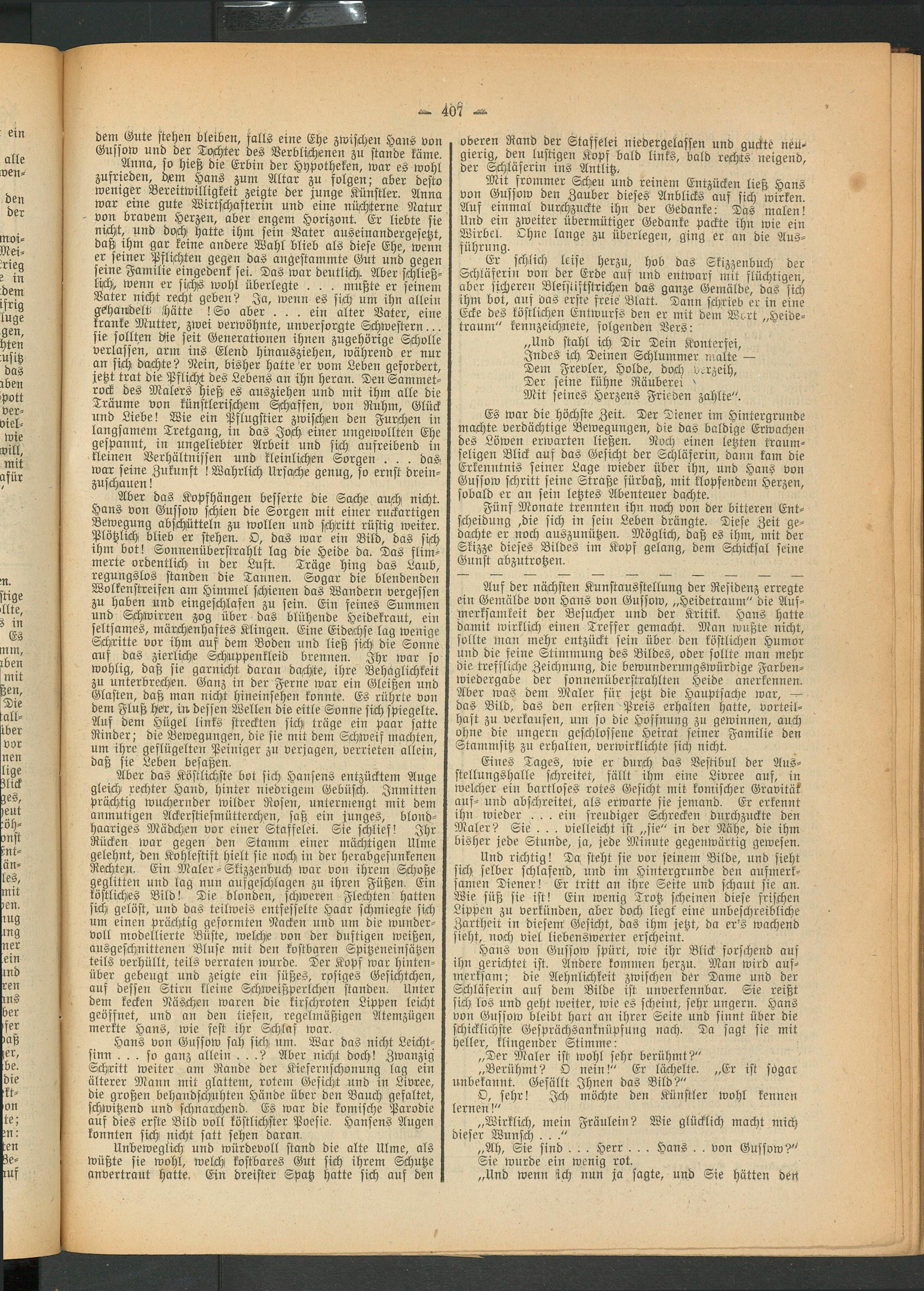 Mit frommer Scheu und reinem Entzücken ließ Hans von Gussow den Zauber dieses Anblicks auf sich wirken. Ans einmal durchzuckte ihn der Gedanke: Das malen' Und ein zweiter übermütiger Gedanke packte ihn wie ein Wirbel. Ohne lange zu überlegen, ging er an die Ausführung.