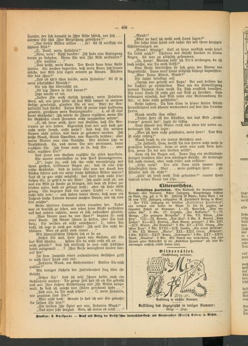 „Lassen .Sie mich ehrlich sprechen, mein Fraulem. Gern, ach, wie gern hatte ich das Bild immer in meinem Besitze gewünscht, glauben Sie es mir. Aber die Verhältnisse sind stärker. Dieses Bild ist meine letzte Hoffnung gewesen, gleichsam mein Rettungsanker... o, es ist eine harte Geschichte! Ich, würde sie Ihnen erzählen, wenn Sre die Geschichte eines Fremden nicht langweilen würde".