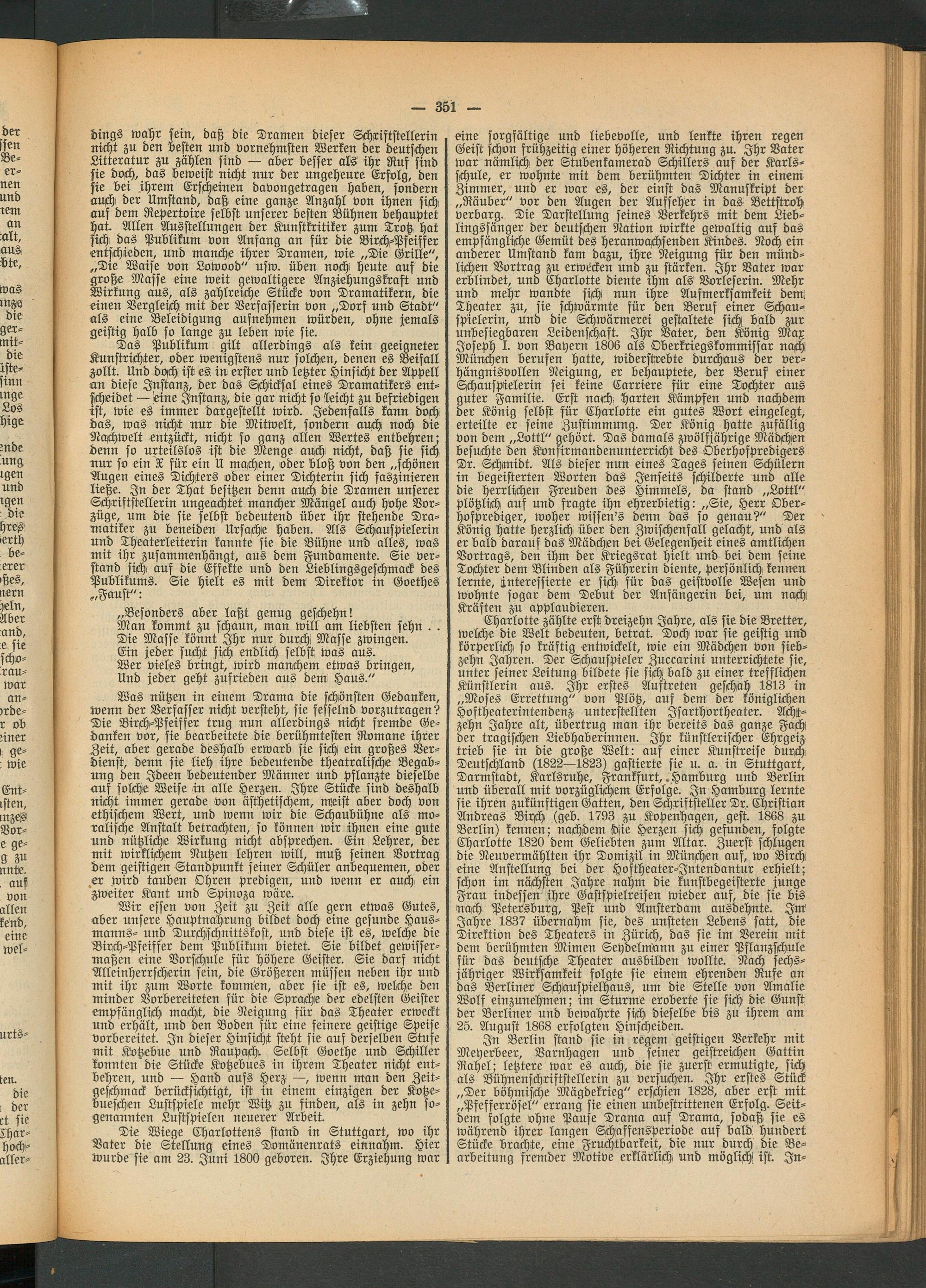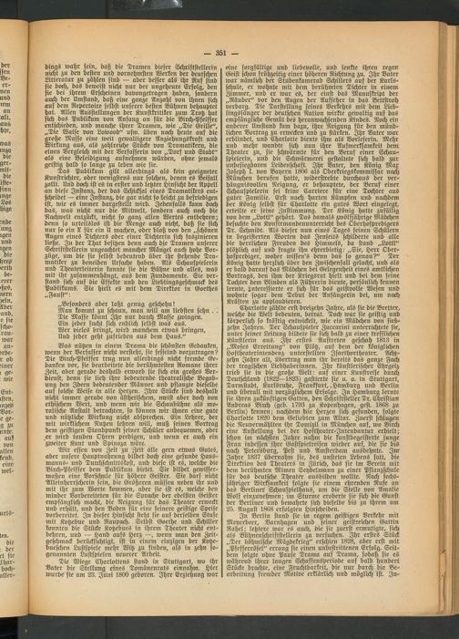 Charlotte zählte erst dreizehn Jahre, als sie die Bretter, welche die Welt bedeuten, betrat. Doch war sie geistig und körperlich so kräftig entwickelt, wie ein Mädchen von siebzehn Jahren. Der Schauspieler Zuecarini unterrichtete sie, unter seiner Leitung bildete sie sich bald zu einer trefflichen Künstlerin aus. Ihr erstes Auftreten geschah 1813 in „Moses Errettung" von Plötz, auf dem der königlichen Hoftheaterintendenz unterstellten Jsarthortheater. Achtzehn Jahre alt, übertrug man ihr bereits das ganze Fach der tragischen Liebhaberinnen. Ihr künstlerischer Ehrgeiz trieb sie in die große Welt: aus einer Kunstreise durch Deutschland (1822—1823) gastierte sie u. a. in Stuttgart, Darmstadt, Karlsruhe, Frankfurt, .Hamburg und Berlin und überall mit vorzüglichem Erfolge. In Hamburg lernte sie ihren zukünftigen Gatten, den Schriftsteller Dr. Christian Andreas Birch; (geb. 1793 zu Kopenhagen, gest. 1868 zu Berlin) kennen: nachdem (biie Herzen sich gefunden, folgte Charlotte 1820 dem Geliebten zum Altar. Zuerst schlugen die Neuvermählten ihr Domizil in München auf, wo Birch eine Anstellung bei der Hoftheater-Jntendantur erhielt; schon int nächsten Jahre nahm die kunstbegeisterte junge Frau indessen ihre Gastspielreisen wieder auf, die sie bis nach Petersburg, Pest und Amsterdam ausdehnte. Im Jahre 1837 übernahm sie, des unsteten Lebens satt, die Direktion des Theaters in Zürich;, das sie im Verein mit dem berühmten Mimen Seydelniann zu einer Pflanzschule für das deutsche Theater ausbilden wollte. Nach sechsjähriger Wirksamkeit folgte sie einem ehrenden Rufe an das Berliner Schauspielhaus, um die Stelle von Amalie Wolf einzunehmen; im Sturme eroberte sie sich! die Gunst der Berliner und bewahrte sich dieselbe bis zu ihrem am 25. August 1868 erfolgten Hinscheiden.