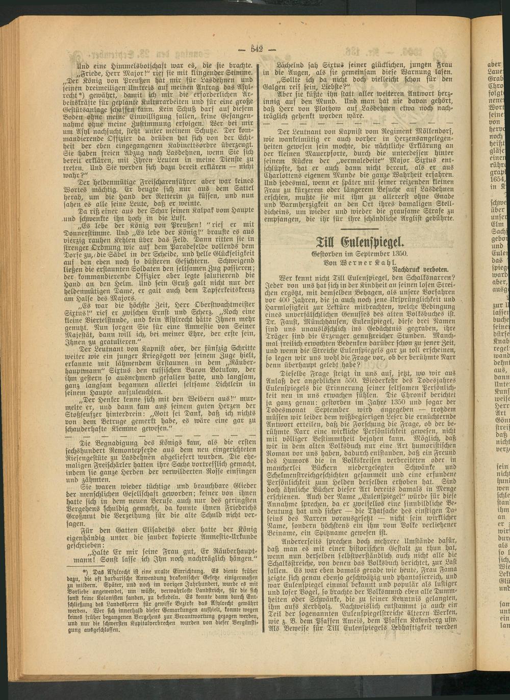 Wer kennt nicht Till Eulenspiegel, den Schalksnarren? Jeder von uns hatsichin der Kindheit an seinen losen Streichen ergötzt, mit demselben Behagen, als unsere Vorfahren vor 400 Jahren, die ja anch noch jene Ursprünglichkeit und Harmlosigkeit zur Lektüre mitbrachten, welche Bedingung eines unverfälschlichen Genusses des alten Volksbuches ist. Dr. Faust, Münchhausen, Eulenspiegel, diese drei Namen sind uns unauslöschlich ins Gedächtnis gegraben, ihre Träger sind die Erzeuger genußreicher Stunden. Manchmal freilich erwachten Bedenken darüber schön zu jener Zeit, und wenn die Streiche Eulenspiegels gar zu toll erscheinen, so legen wir uns wohl die Frage vor, ob der berühmte Narr denn überhaupt gelebt habe?