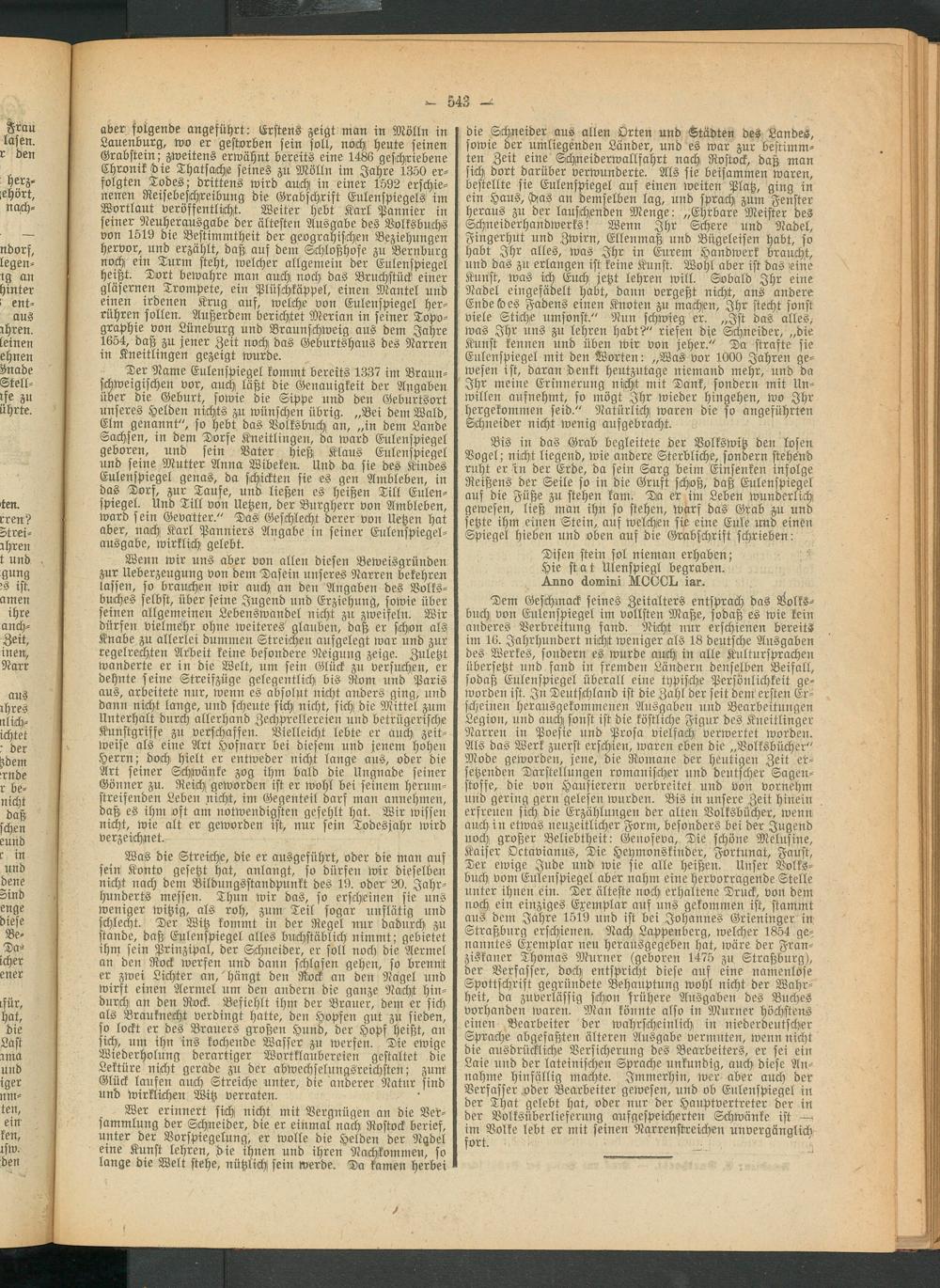 aber folgende angeführt: Erstens zeigt man in Mölln in Lauenburg, wo er gestorben sein soll, noch heute seinen Grabstein; zweitens erwähnt bereits eine 1486 geschriebene Chronik-die Thatsache seines zu Mölln im Jahre 1350 erfolgten Todes; drittens wird auch in einer 1592 erschienenen Reisebeschireibung die Grabschrift Eulenspiegels im Wortlaut veröffentlicht. Weiter hebt Karl Pannier in seiner Neuherausgabe der ältesten Ausgabe des Volksbuchs von 1519 die Bestimmtheit der geografischen Beziehungen hervor, und erzählt, daß auf dem Schloßhofe zu Bernburg noch ein Turm steht, welcher allgemein der Eulenspiegel heißt. Tort bewahre man auch noch das Bruchstück einer gläsernen Trompete, ein Plüschkäppel, einen Mantel und einen irdenen Krug auf, welche von Eulenspiegel herrühren sollen. Außerdem berichtet Merian in seiner Topographie von Lüneburg und Braunschweig aus dem Jahre 1654, daß zu jener Zeit noch das Geburtshaus des Narren in Kneitlingen gezeigt wurde.