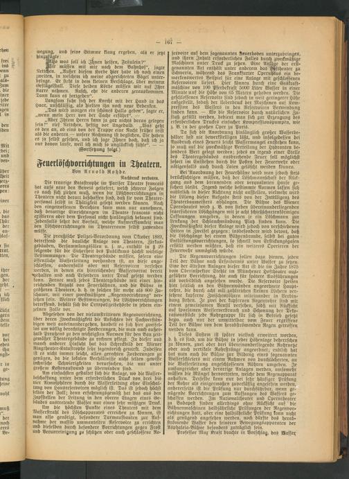 Abgesehen von der vielumstrittenen Regenvorrichtung, über deren Zweckmäßigkeit die Ansichten der Sachverständigen weit auseinandergehen, handelt es sich hier zweifellos um völlig berechtigte Forderungen, die man auch außerhalb Preußens zu den wichtigsten Normen für den Bau zeitgemäßer Theatergebäude zu rechnen pflegt. In dieser und manch anderer Hinsicht hat das Schreckbild der Wiener Ringtheater-Katastrophe sehr segensreich gewirkt. Indessen ist es nicht immer leicht, allen gerechten Forderungen zu genügen, da die lokalen Verhältnisse nicht selten gewisse technische Schwierigkeiten verursachen, die nur' unter großem Kostenaufwand zu überwinden sind.