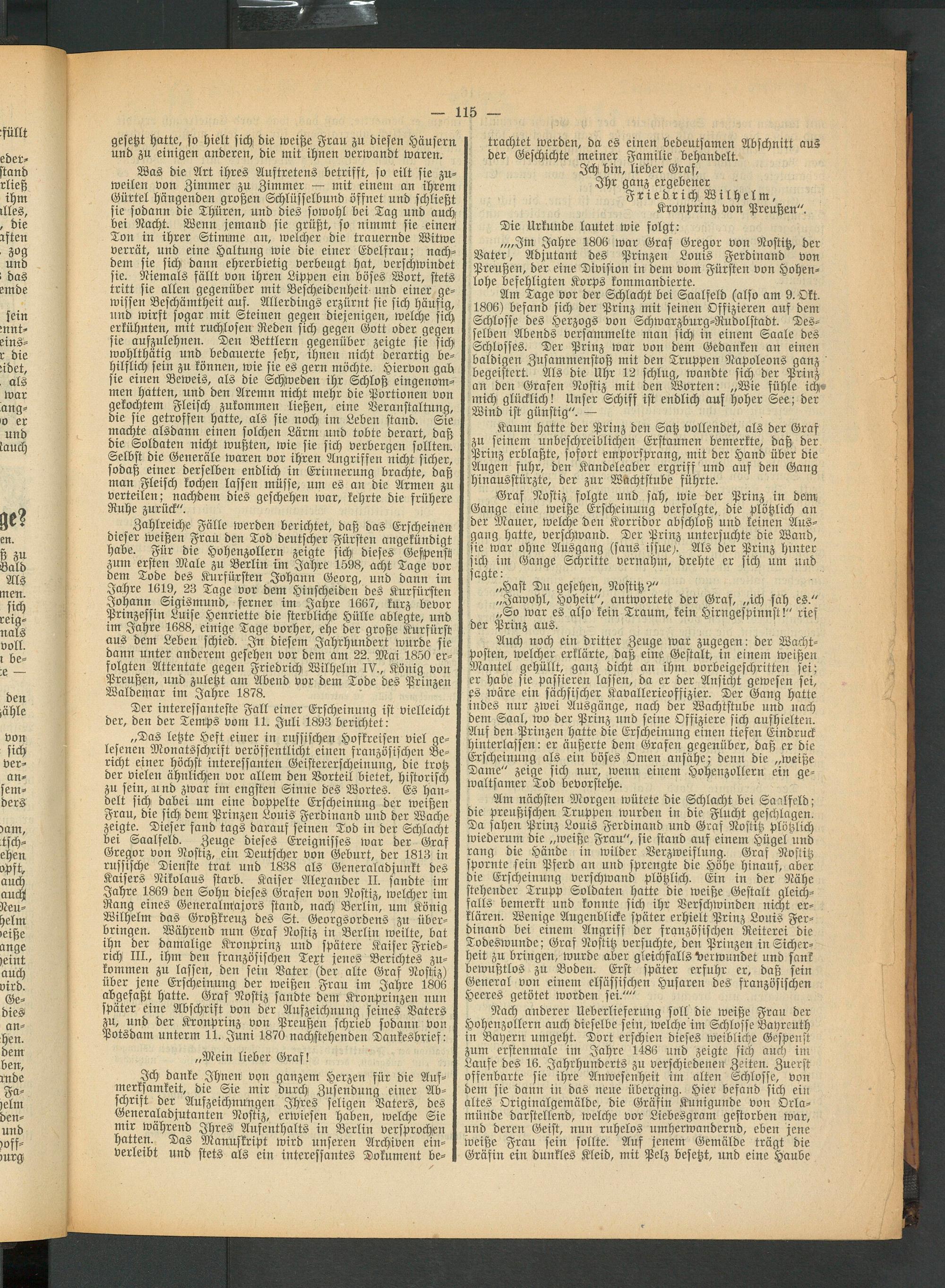 „Das letzte Heft einer in russischen Hofkreisen viel gelesenen Monatsschrift veröffentlicht einen französischen Bericht einer höchst interessanten Geistererscheinung, die trotz der vielen ähnlichen vor allem den Vorteil bietet, historisch zu sein, und zwar im engsten Sinne des Wortes. Es handelt sich dabei um eine doppelte Erscheinung der weißen Frau, die sich dem Prinzen Louis Ferdinand und der Wache zeigte. Dieser fand tags darauf seinen Tod in der Schlacht bei Saalfeld. Zeuge dieses Ereignisses war der Gras Gregor von Nostiz, ein Deutscher von Geburt, der 1813 in russische Dienste trat und 1838 als Generaladjunkt des Kaisers Nikolaus starb. Kaiser Alexander II. sandte im Jahre 1869 den Sohn dieses Grafen von Nostiz, welcher im Rang eines Generalmäjors stand, nach! Berlin, um König Wilhelm das Großkreuz des St. Georgsordens zu überbringen. Während nun Graf Nostiz in Berlin weilte, bat ihn der damalige Kronprinz und spätere Kaiser Friedrich III., ihm den französischen Text jenes Berichtes zukommen zu lassen, den sein Vater (der alte Graf Nostiz) über jene Erscheinung der weißen Frau im Jahre 1806 abgefaßt hatte. Gras Nostiz sandte dem Kronprinzen nun später eine Abschrift von der Aufzeichnung seines Vaters zu, und der Kronprinz von Preußen schrieb sodann von Potsdam unterm 11. Juni 1870 nachstehenden Dankesbrief: