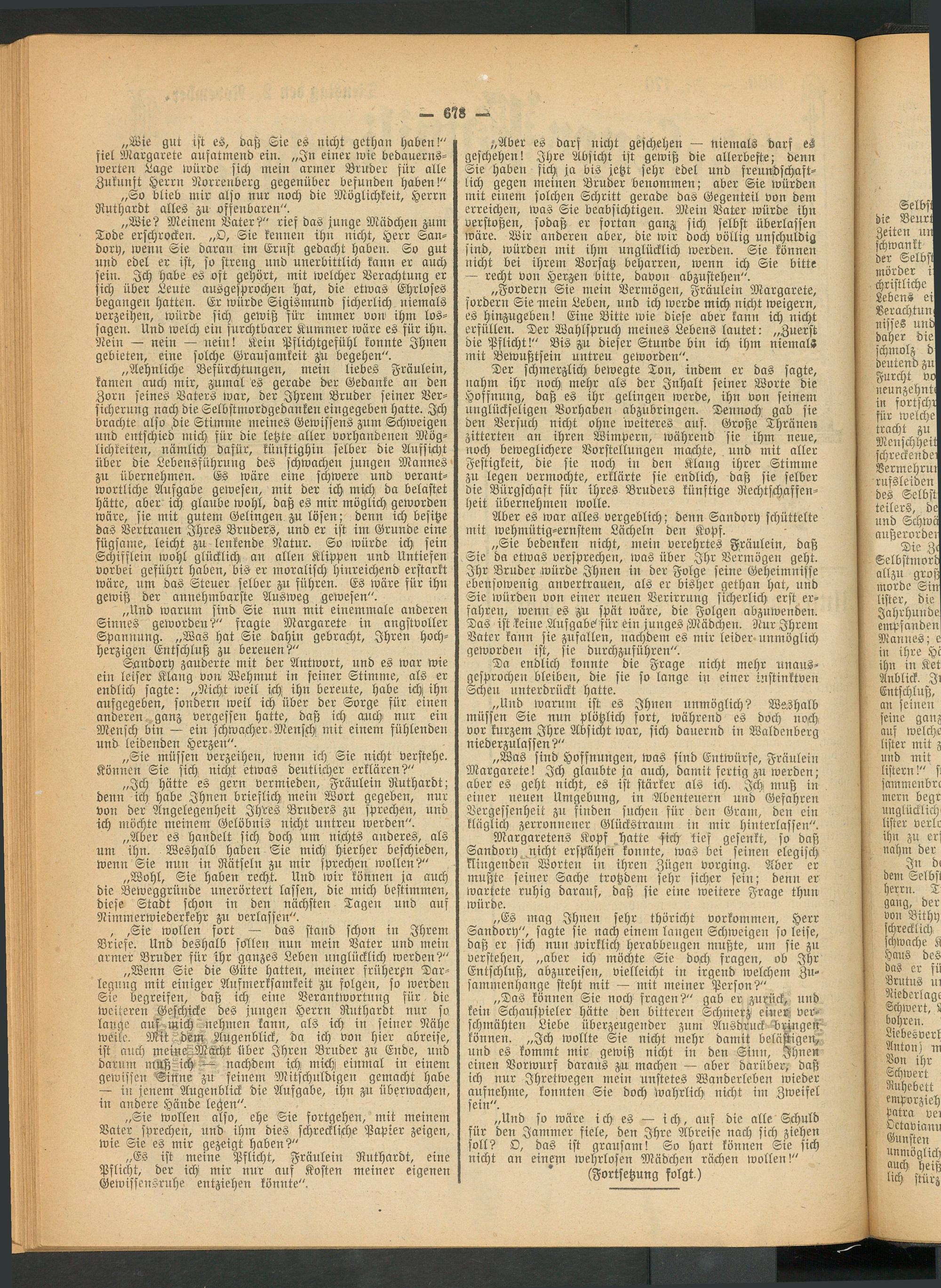 Sandory zauderte mit der Antwort, und es war wie ein leiser Klang von Wehmut in seiner Stimme, als er endlich sagte: „Nicht weil ich ihn bereute, habe ich, ihn aufgegeben, sondern weil ich über der Sorge für einen anderen ganz vergessen hatte, daß ich auch nur ein Mensch bin — ein schwacher Mensch mit einem fühlenden und leidenden Herzen".