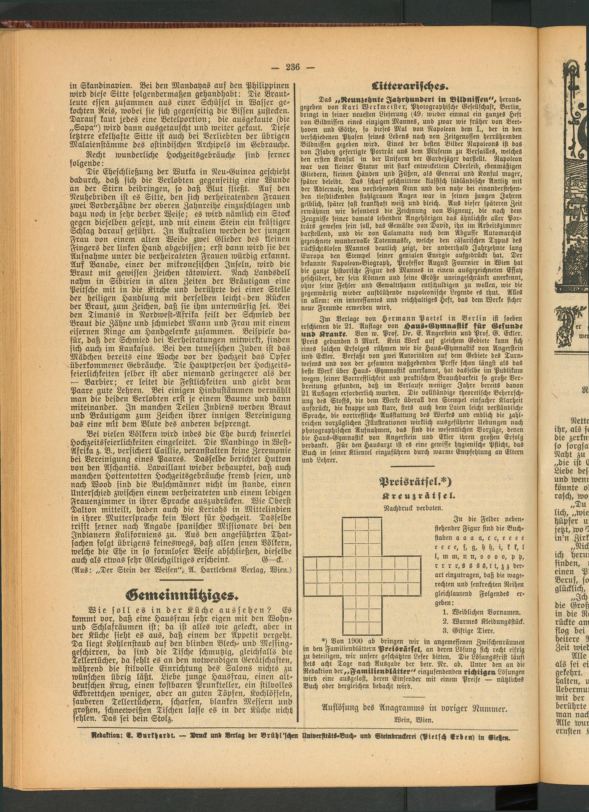 *) Von 1900 ab bringen wir in angemessenen Zwischenräumen in den Familienblättern Preisrütsel, an deren Lösung sich recht eifrig zu beteiligen, wir unsere geschätzten Leser bitten. Die Lösungsfrist läuft stets acht Tage nach Ausgabe der betr. Nr. ab. Unter den an die Redaktion der,,Familienblätter" einzusendenden richtigen Lösungen wird eine ausgelost, deren Einsender mit einem Preise — nützliches Buch oder dergleichen bedacht wird.