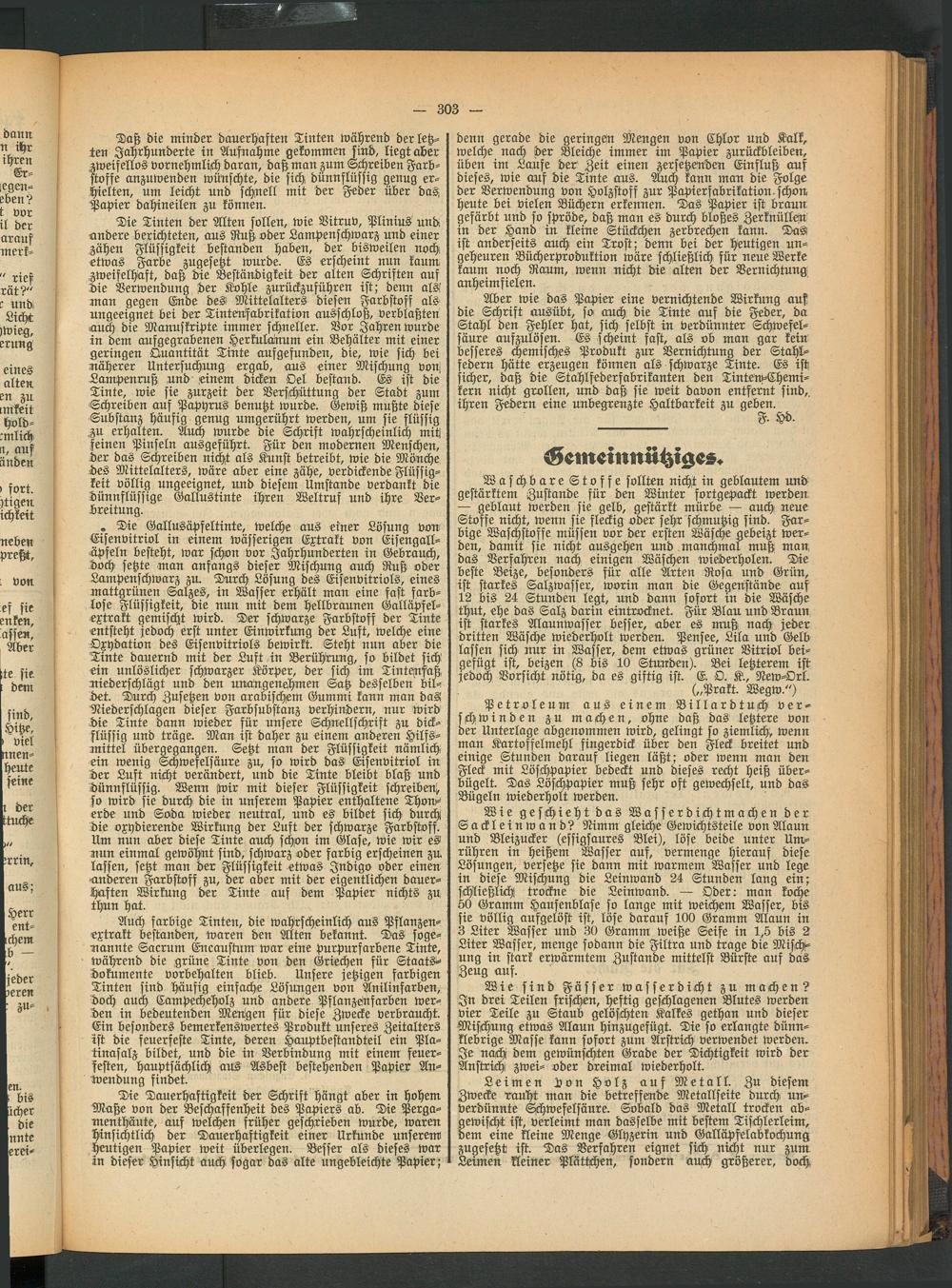 Daß die minder dauerhaften Tinten während der letzten Jahrhunderte in Ausnahme gekommen sind, liegt aber Zweifellos vornehmlich daran, daß man zum Schreiben Farbstoffe anzuwenden wünschte, die sich dünnflüssig genug erhielten, um leicht und schnell mit der Feder über das Papier dahineilen zu können.