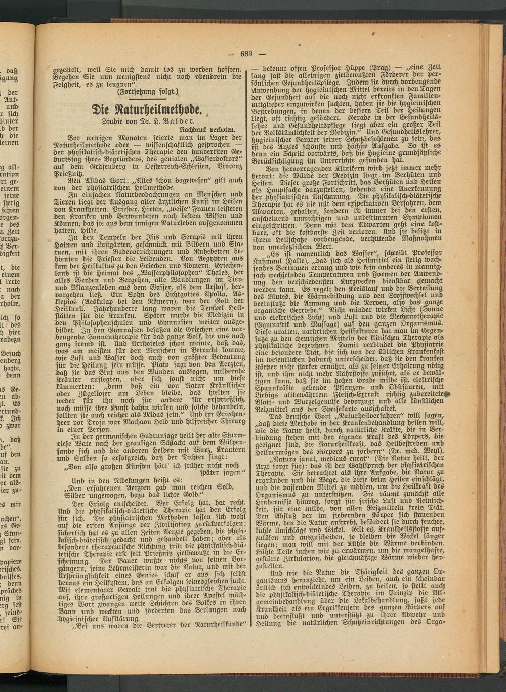 Und wie die Natur die Thätigkett des ganzen Organismus heranzieht, um ein Leiden, auch ein scheinbar örtlich sich entwickelndes Leiden, zu heilem, so stellt auch die physikalisch-diätetische Therapie im Prinzip die Ml- gemeinbehandlung über die Lokalbehandlung, faßt jede Krankheit als ein Ergriffensein des ganzen Körpers auf und beeinflußt und unterstützt zu ihrer Abwehr und Heilung die natürlichen Schutzeinrichtungen des Orga-