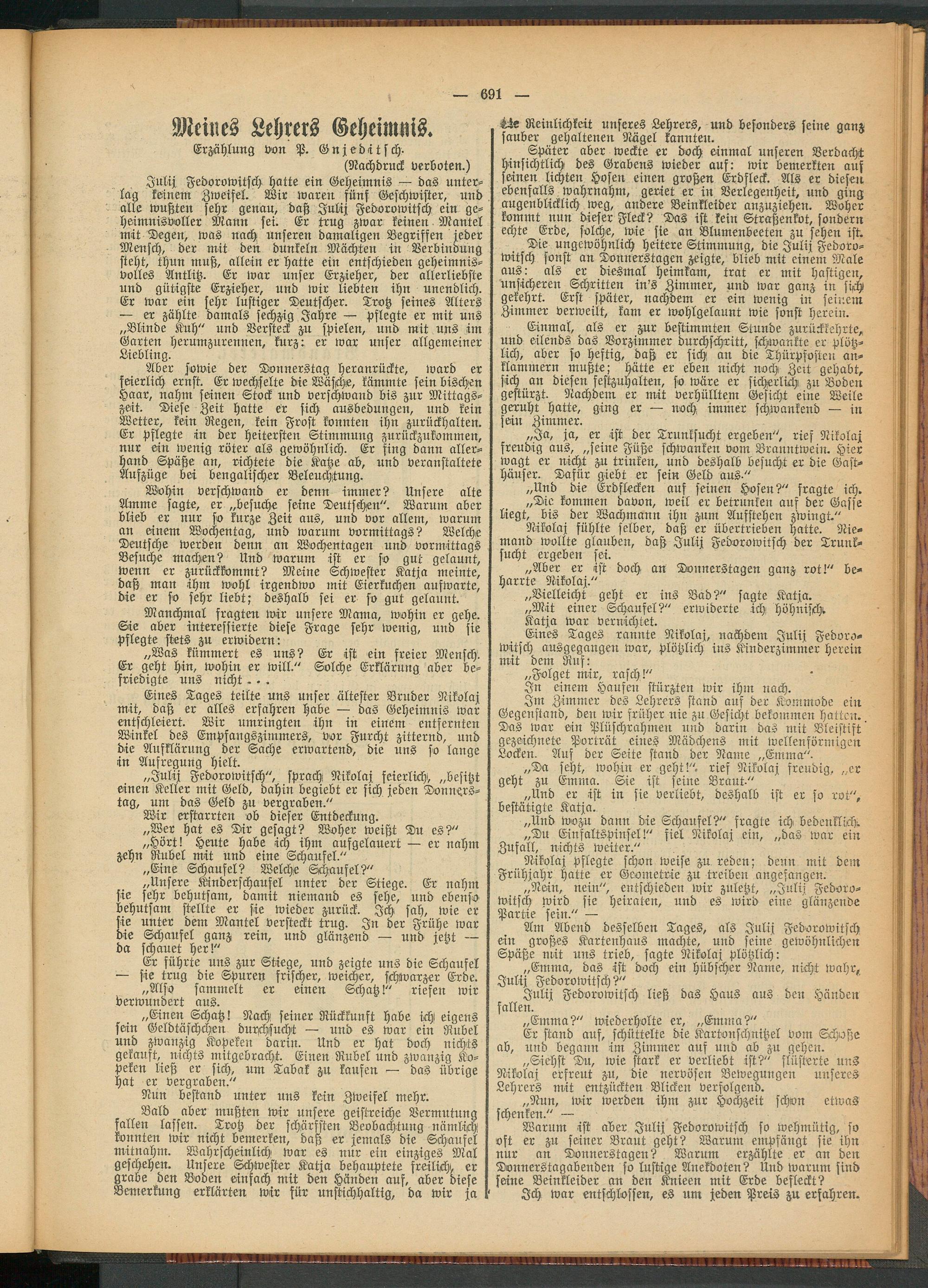 Julij Fedorowitsch hatte ein Geheimnis — das unterlag keinem Zweifel. Wir waren fünf Geschwister, und alle wußten sehr genau, daß Julij Fedorowitsch ein geheimnisvoller Mann sei. Er trug zwar keinen Mantel mit Degen, was nach unseren damaligen Begriffen jeder Mensch, der mit den dunkeln Mächten in Verbinoung steht, thun muß, allein er hatte ein entschieden geheimnisvolles Antlitz. Er war unser Erzieher, der allerliebste und gütigste Erzieher, und wir liebten ihn unendlich. Er war ein sehr lustiger Deutscher. Trotz seines Alters — er zählte damals sechzig Jahre — pflegte er mit uns „Blinde Kuh" und Versteck zu spielen, und mit uns im Garten herumzurennen, kurz: er war unser allgemeiner Liebling.