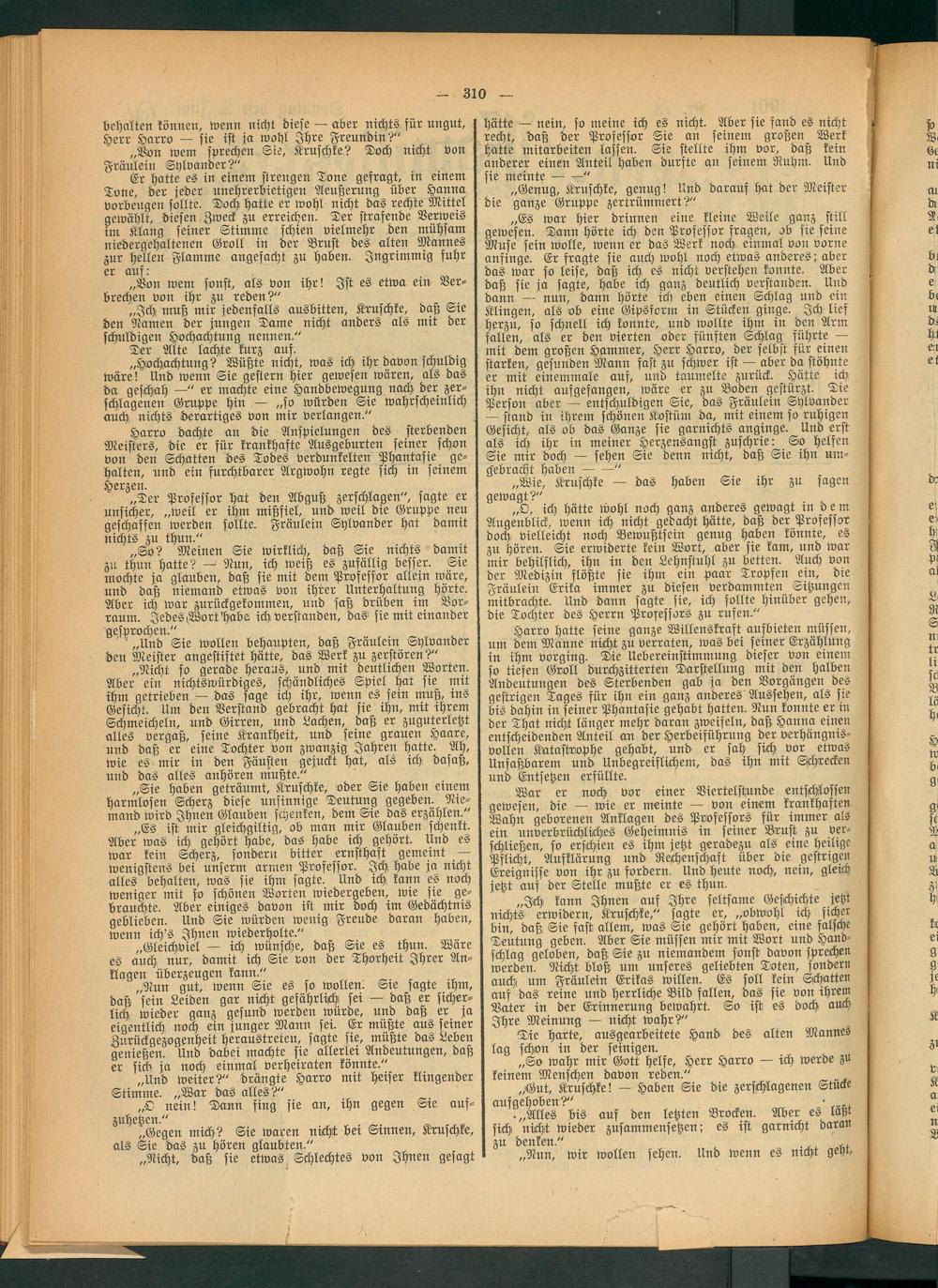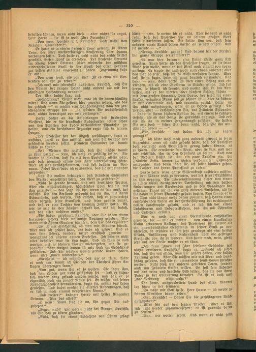 „O, ich hätte wohl noch ganz anderes gewagt in b e m Augenblick, wenn ich nicht gedacht hätte, daß der Professor doch vielleicht noch Bewußtsein genug haben könnte, es zu hören. Sie erwiderte kein Wort, aber sie kam, und war mir behilflich, ihn in den Lehnstuhl zu betten. Auch von der Medizin flößte sie ihm ein paar Tropfen ein, die Fräulein Erika immer zu diesen verdammten Sitzungen mitbrachte. Und dann sagte sie, ich sollte hinüber gehen, die Tochter des Herrn Professors zu rufen."