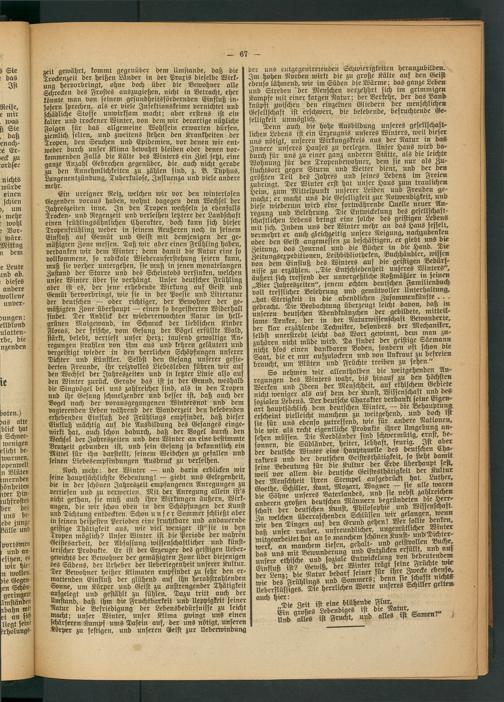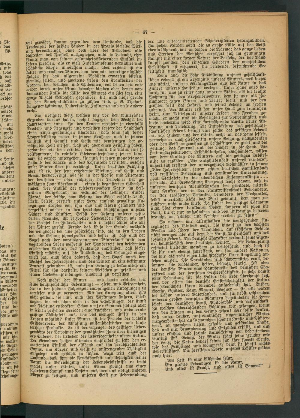 Noch mehr: der Winter — und darin erblicken wir seine hauptsächlichste Bedeutung! — giebt uns Gelegenheit, die in der schönen Jahreszeit empfangenen Anregungen zu vertiefen und zu verwerten. Mit der Anregung allein ist's nicht gethan, sie muß auch ihre Wirkungen äußern, Wirkungen, die wir schon oben in den Schöpfungen der Kunst und Dichtung entdeckten. Schon unser Sommer schließt aber in seinen heißesten Perioden eine fruchtbare und andauernde geistige Thätigkeit aus, wie viel weniger ist sie in den Tropen möglich? Unser Winter ist die Periode der wahren Geistesarbeit, der Abfassung wissenschaftlicher und künstlerischer Produkte. Er ist der Erzeuger des geistigen Ueber- gewichts der Bewohner der gemäßigten Zone über diejenigen des Südens, der Urheber der Ueberlegenheit unserer Kultur. Der Bewohner heißer Klimaten empfindet zu sehr den ermattenden Einfluß der glühend auf ihn herabstrahlenden Sonne, um Körper und Geist zu anstrengender Thätigkeit aufgelegt und gestählt zu fühlen. Dazu tritt auch der ,