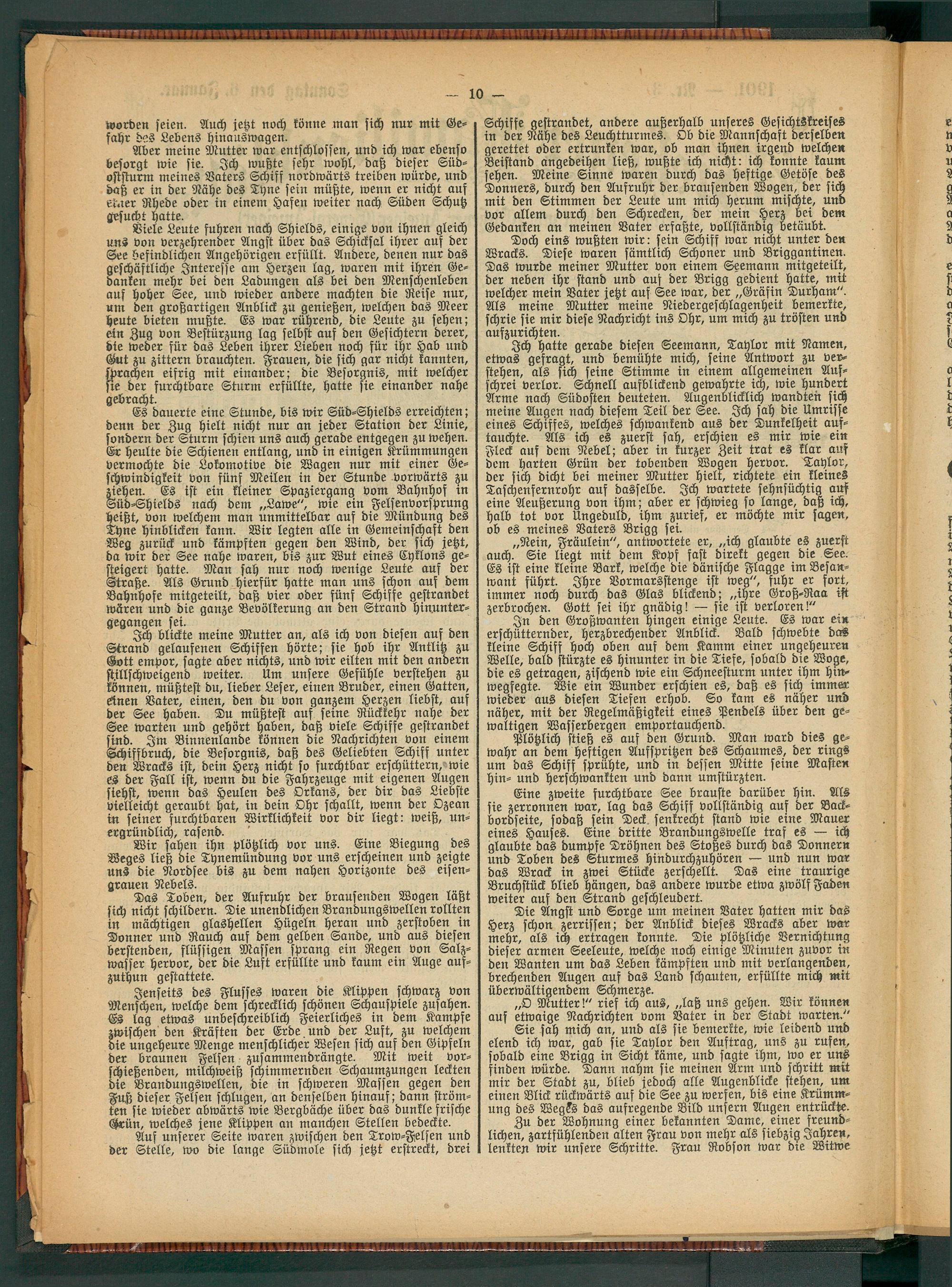 Es dauerte eine Stunde, bis wir Süd-Shields erreichten; denn der Zug hielt nicht nur an jeder Station der Linie, sondern der Sturm schien uns auch gerade entgegen zu wehen. Er heulte die Schienen entlang, und in einigen Krümmungen vermochte die Lokomotive die Wagen nur mit einer Geschwindigkeit von fünf Meilen in der Stunde vorwärts zu ziehen. Es ist ein kleiner Spaziergang vom Bahnhof in Süd-Shields nach dem „Sartre", wie ein Felsenvorsprung heißt, von welchem man unmittelbar auf die Mündung des Thne Hinblicken kann. Wir legten alle in Gemeinschaft den Weg zurück und kämpften gegen den Wind, der sich jetzt, da wir der See nahe waren, bis zur Wut eines Cyklons gesteigert hatte. Man sah nur noch wenige Leute auf der Straße. Als Grund hierfür hatte man uns schon auf dem Bahnhofe mitgeteilt, daß vier oder fünf Schiffe gestrandet wären und die ganze Bevölkerung an den Strand hinuntergegangen sei.