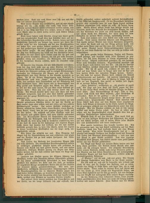 Ich blickte meine Mutter an, als ich von diesen auf den Strand gelaufenen Schiffen hörte; sie hob ihr Antlitz zu Gott empor, sagte aber nichts, und wir eilten mit den andern stillschweigend weiter. Um unsere Gefühle verstehen zu können, müßtest du, lieber Leser, einen Bruder, einen Gatten, einen Vater, einen, den du von ganzem Herzen liebst, auf der See haben. Du müßtest auf seine Rückkehr nahe der See warten und gehört haben, daß viele Schiffe gestrandet sind. Im Binnenlande können die Nachrichten von einem Schiffbruch, die Besorgnis, daß des Geliebten Schiff unter den Wracks ist, dein Herz nicht so furchtbar erschüttern, wie es der Fall ist, wenn du die Fahrzeuge mit eigenen Augen siehst, wenn das Heulen des Orkans, der dir das Liebste vielleicht geraubt hat, in dein Ohr schallt, wenn der Ozean in seiner furchtbaren Wirklichkeit vor dir liegt: weiß, unergründlich, rasend.