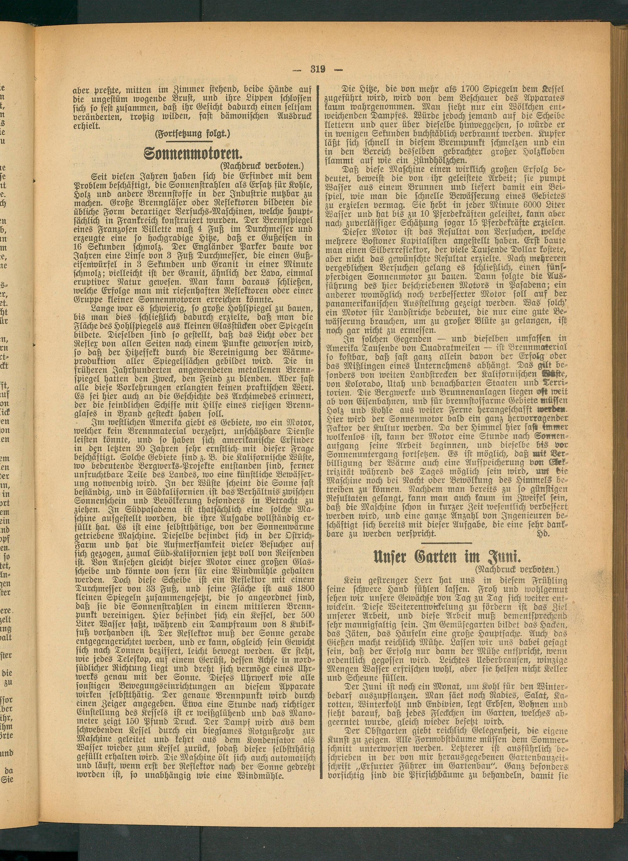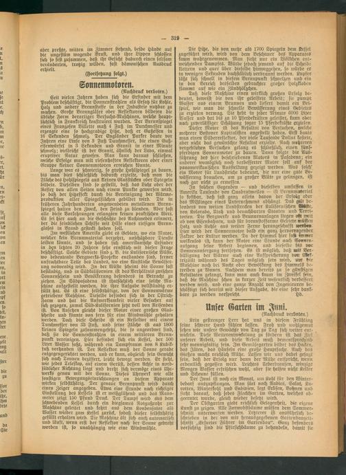 Dieser Motor ist das Resultat von Versuchen, welche mehrere Bostoner Kapitalisten angestellt haben. Erst baute man einen Silberreflektor, der viele Tausende Dollar kostete, aber nicht das gewünschte Resultat erzielte. Nach mehreren vergeblichen Versuchen gelang es schließlich!, einen fünf- pferdigen Sonnenmotor zu bauen. Dann folgte die Ausführung des hier beschriebenen Motors in Pasadena; ein anderer womöglich, noch verbesserter Motor soll auf der panamerikanischen Ausstellung gezeigt werden. Was solch,' ein Motor für Landstriche bedeutet, die nur eine gute Bewässerung brauchen, um zu großer Blüte zu gelangen, ist noch gar nicht zu ermessen.
