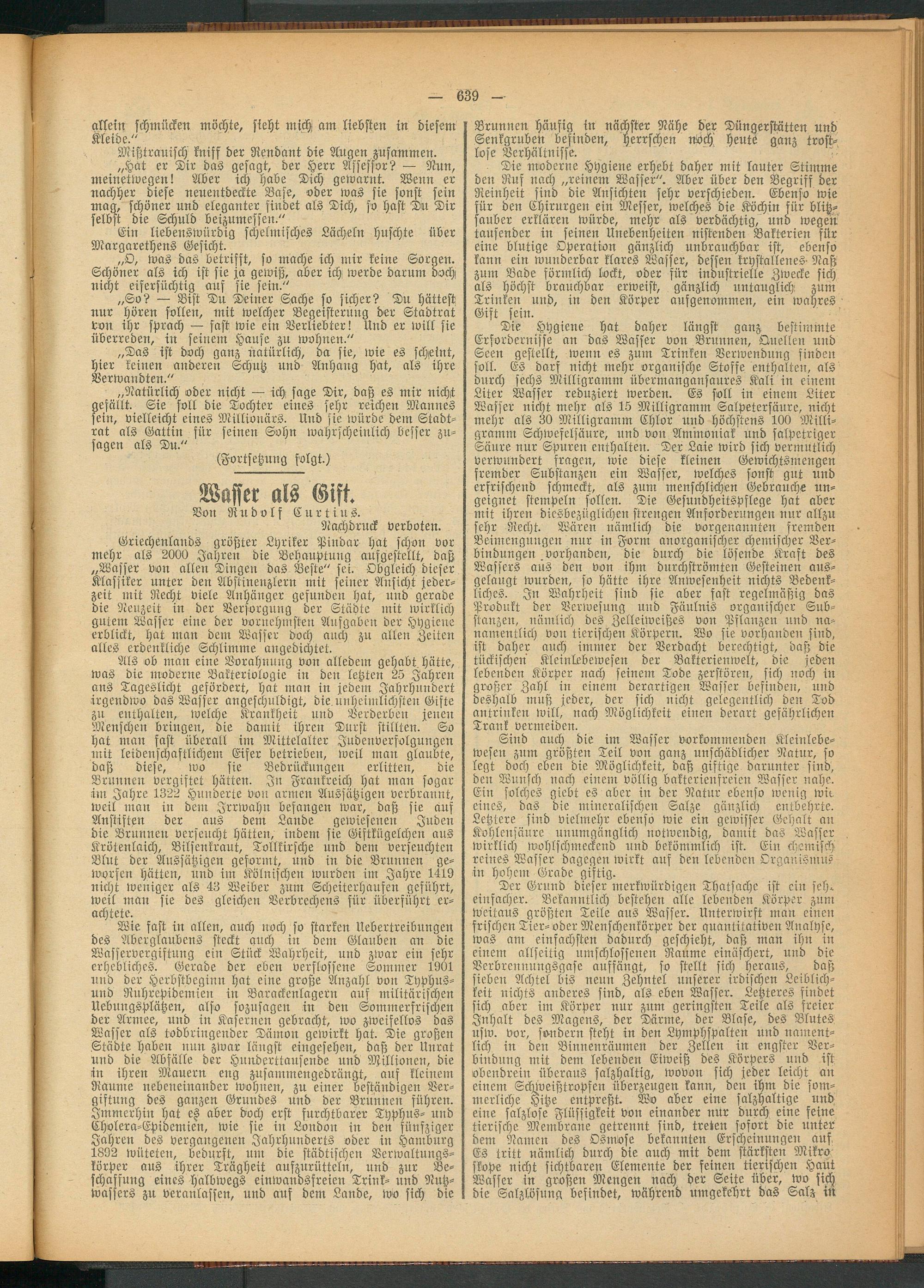 Wie fast in allen, auch noch so starken Uebertreibungen des Aberglaubens steckt auch in dem Glauben an die Wasservergiftung ein Stück Wahrheit, und zwar ein sehr erhebliches. Gerade der eben verflossene Sommer 1901 und der Herbstbeginn hat eine große Anzahl von Typhus- und Ruhrepidemien in Barackenlagern auf militärischen Uebungsplätzen, also sozusagen in den Sommerfrischen der Armee, und in Kasernen gebracht, wo zweifellos das Wasser als todbringender Dämon gewirkt hat. Die großen Städte haben nun zwar längst eingesehen, daß der Unrat und die Abfälle der Hunderttausende und Millionen, die in ihren Mauern eng zusammengedrängt, auf kleinem Raume nebeneinander wohnen, zu einer beständigen Vergiftung des ganzen Grundes und der Brunnen führen. Immerhin hat eß aber doch erst furchtbarer Typhus- und Cholera-Epidemien, wie sie in London in den fünfziger Jahren des vergangenen Jahrhunderts oder in Hamburg 1892 wüteten, bedurft, um die städtischen Verwaltnngs- körper aus ihrer Trägheit aufzurütteln, und zur Beschaffung eines halbwegs einwandsfreien Trink- und Nutzwassers zu veranlassen, und auf dem Lande, wo sich die