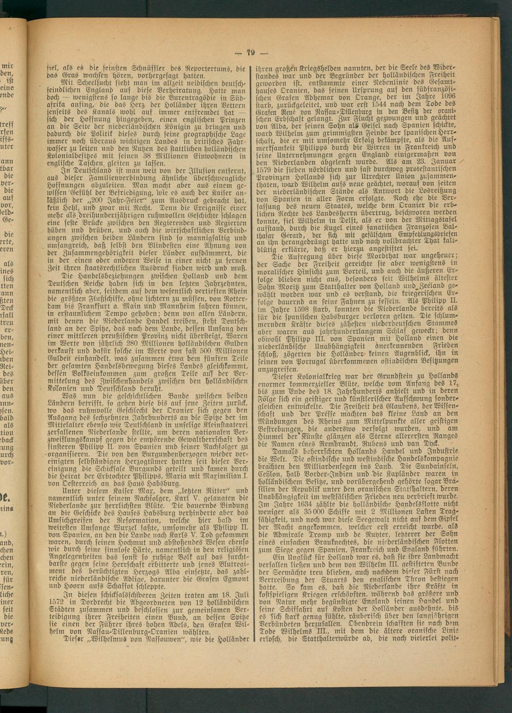 Was nun die geschichtlichen Bande zwischen beiden Ländern betrifft, so gehen diese bis auf jene Zeiten zurück, wo das ruhmvolle Geschlecht der Oranier sich gegen den Ausgang des sechzehnten Jahrhunderts an die Spitze der im Mittelalter ebenso wie Deutschland in unselige Kleinstaaterei zerfallenen Niederlande stellte, um deren nationalen Verzweiflungskampf gegen die empörende Gewaltherrschaft des finsteren Philipp II. von Spanien und seiner Nachfolger M organisieren. Die von den Burgundenherzogen wieder vereinigten selbständigen Herzogtümer hatten seit dieser Vereinigung die Schicksale Burgunds geteilt und kamen durch die Heirat der Erbtochter Philipps, Maria mit Maximilian I. von Oesterreich an das Haus Habsburg.