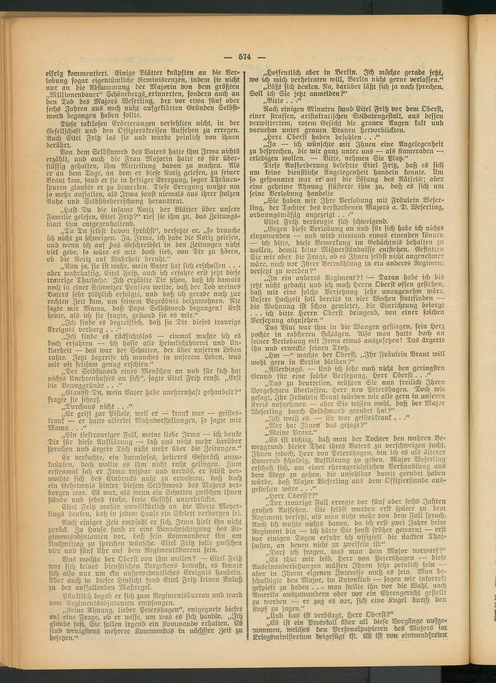 „Das zu beurteilen, müßten Sie nun freilich Ihren Vorgesetzten überlassen, Herr von Petershagen. Doch wie gesagt, Ihr Fräulein Braut würden wir alle gern in unseren Kreis aufnehmen — aber Sie wissen wohl, daß der Major 'Weserling durch Selbstmord geendet hat?"