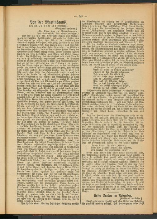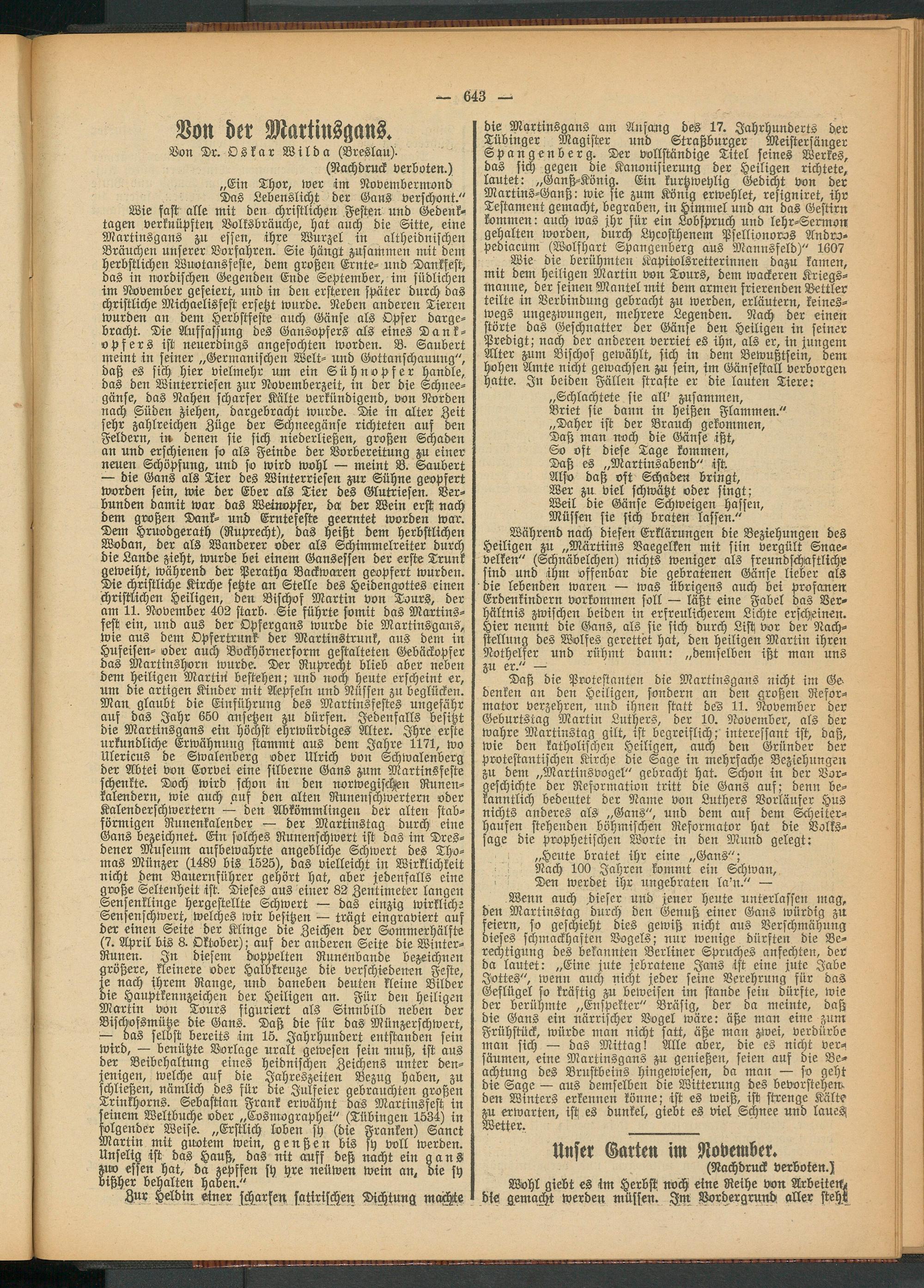 Wenn auch dieser und jener heute unterlassen mag, den Martinstag durch den Genuß einer Gans würdig zu feiern, so geschieht dies gewiß nicht aus Verschmähung dieses schmackhaften Bogels; nur wenige dürften die Berechtigung des bekannten Berliner Spruches anfechten, der da lautet: „Eine jute jebratene Juns ist eine jute Jabe Jottes", wenn auch nicht jeder seine Verehrung für das Geflügel so kräftig zu beweisen im stände sein dürfte, wie der berühmte „Enspekter" Bräsig, der da meinte, daß die Gans ein närrischer Vogel wäre: äße man eine zum Frühstück, würde man nicht satt, äße man zwei, verdürbe man sich — das Mittag! Alle aber, die es nicht versäumen, eine Martinsgans zu genießen, seien auf die Beachtung des Brustbeins hingewiesen, da man — so geht die Sage — aus demselben die Witterung des bevorstehend den Winters erkennen könne; ist es weiß, ist strenge Kälte zu erwarten, ist es dunkel, giebt es viel Schnee und laues Wetter, ___________