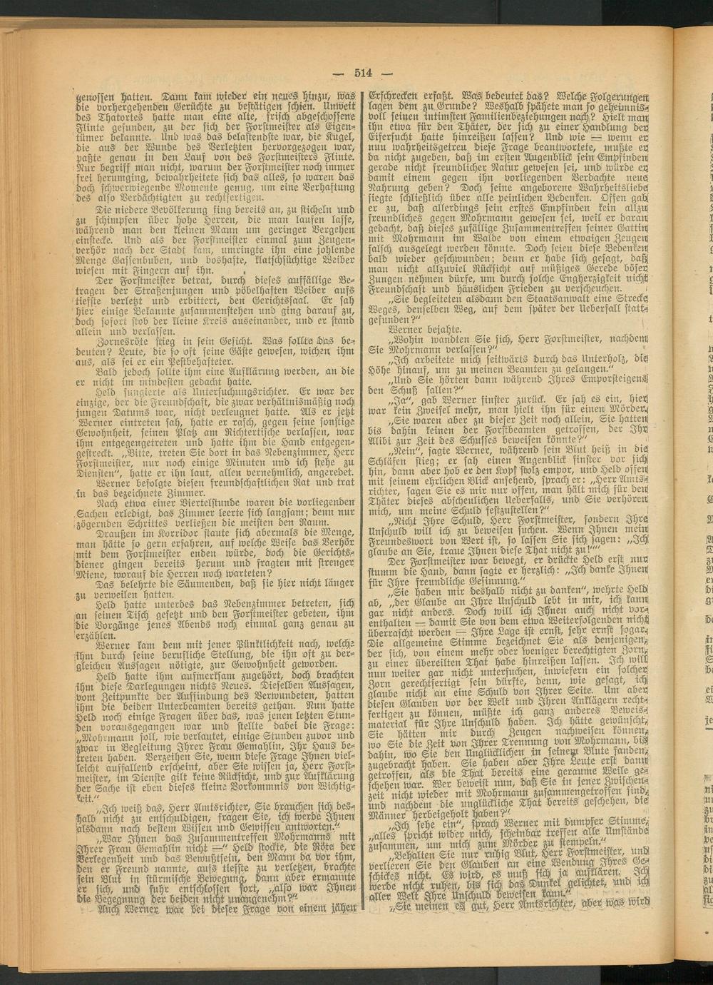 Held fungierte als Untersuchungsrichter. Er ivar der einzige, der die Freundschaft, die zwar verhältnismäßig noch jungen Datums war, nicht verleugnet hatte. Als er jetzt Werner eintreten sah, hatte er rasch, gegen seine sonstige Gewohnheit, seinen Platz am Richtertische verlassen, war ihm entgegengetreten und hatte ihm die Hand entgegengestreckt. „Bitte, treten Sie dort in das Nebenzimmer, Herr Forstmeister, nur noch einige Minuten und ich stehe zu Diensten", hatte er ihn laut, allen vernehmlich, angeredet.