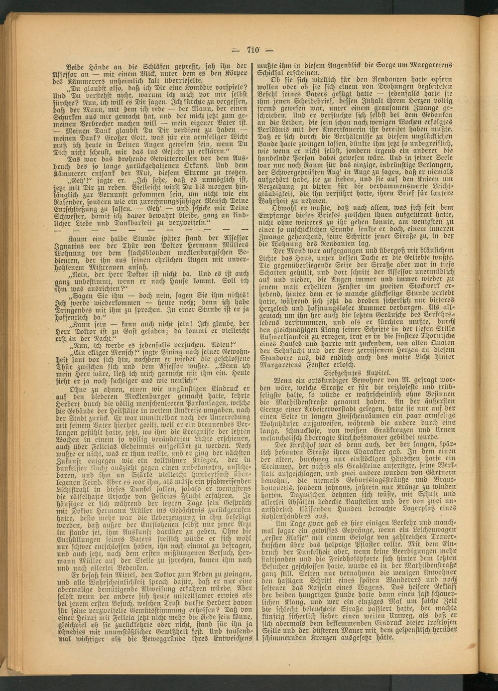 Wenn ein ortskundiger Bewohner von M. gefragt wor- den wäre, welche Straße er für die reizloseste und trübseligste halte, so würde er wahrscheinlich ohne Besinnen die Mathildenstraße genannt haben. An der äußersten Grenze einer Arbeitervorstadt gelegen, hatte sie nur auf der einen Seite in langen Zwischenräumen ein paar armselige Wohnhäuser aufzuweisen, während die andere durch eine lange, schmucklose, von weißen Grabkreuzen und Urnen melancholisch überragte Kirchhofsmauer gebildet wurde.