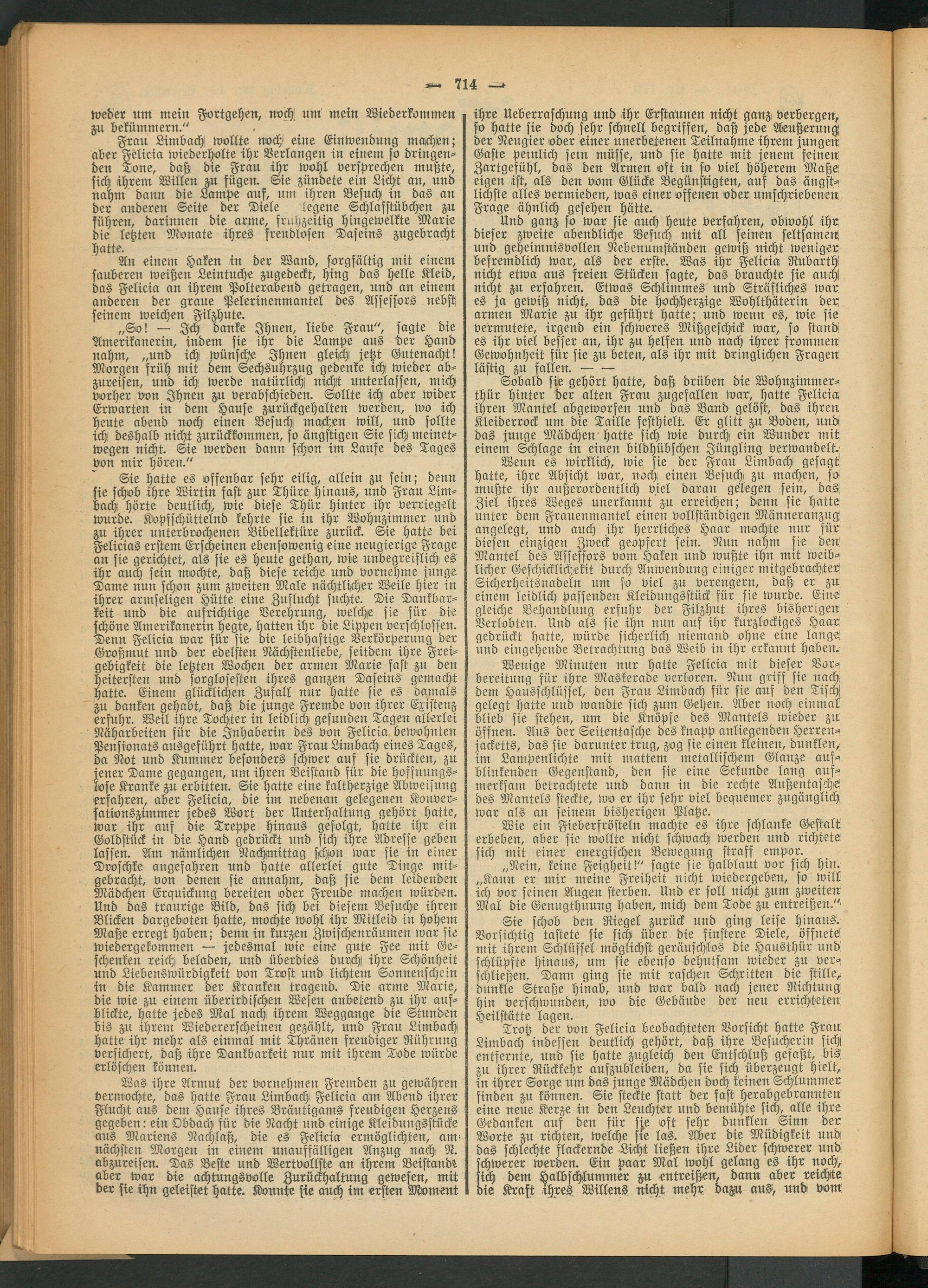 Was ihre Armut der vornehmeu Fremden zu gewähren vermochte, das hatte Frau Limbach Felicia am Abend ihrer Flucht aus dem Hause ihres Bräutigams freudigen Herzens gegeben: ein Obdach für die Nacht und einige Kleidungsstticke aus Mariens Nachlaß, die es Felicia ermöglichten, (int1 nächsten Morgen in einem unauffälligen Anzug nach N. abzureisen. Das Beste und Wertvollste an ihrem Beistands aber war die achtungsvolle Zurückhaltung gewesen, mit der sie ihn geleistet hatte. Konnte sie auch im ersten Moment